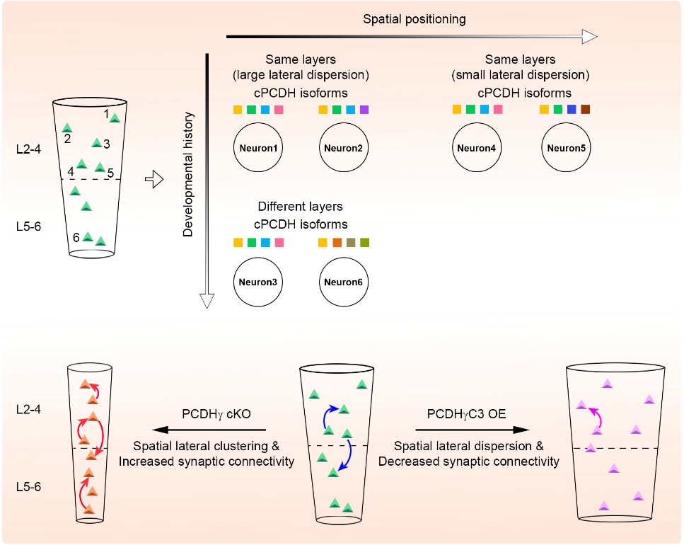 研究人员结合遗传学、神经细胞发育谱系荧光标记示踪、单细胞基因表达深度测序、全脑三维重构和神经细胞嵌合式的功能性分析等,揭示了cPCDH在神经元中的表达新模式,即在大脑新皮层兴奋性神经元中cPCDH亚型的组合表达不是随机的,而呈现与神经元发育史和空间位置紧密关联的表达规律,进而在单细胞水平调控神经元的精细空间分布和突触连接。诸多研究表明,cPCDH的表达异常与多种神经系统疾病(如自闭症、精神分裂症等)紧密相关,因此对cPCDH家族在大脑新皮层中的表达和功能的深入研究为解析相关神经系统疾病的致病机理提供新的思路。