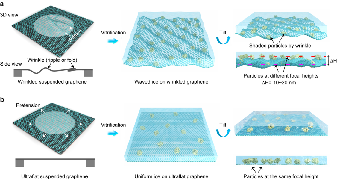 图1 悬空石墨烯支撑膜的平整度影响冰层厚度均一性和成像质量