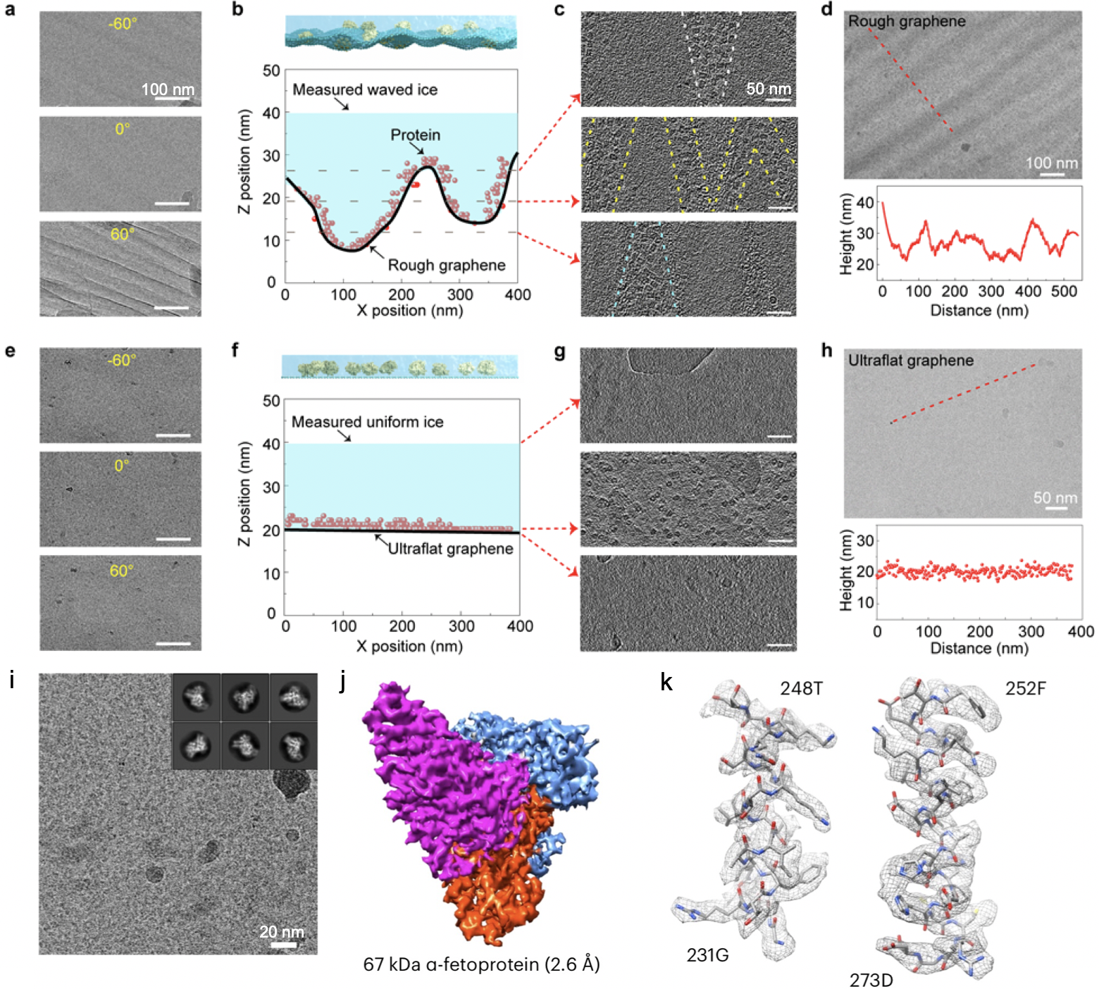 他们将超平整石墨烯载网用于冷冻电镜成像中,发现均匀薄冰能显著提高成像质量。一方面,超平整悬空石墨烯的预应力使得冰层在电子束辐照下不易发生翘曲,有效抑制了样品颗粒在成像时的漂移。另一方面,在不同的倾转角度下(-60°~60°),石墨烯表面均无褶皱结构,避免了高角度成像时褶皱对样品信号的遮蔽。经过测量,利用超平整石墨烯支撑膜所制备的冰层厚度约为20 nm,比较均匀,既可有效封装生物大分子颗粒,也不会过多引入额外的背景噪音。并且,大多数生物大分子颗粒吸附于石墨烯表面,几乎处于同一高度,降低了成像时同一视野下局部欠焦值的差异。与粗糙起伏的石墨烯对比,超平整石墨烯支撑膜保证了高质量数据的收集,提升了成像效率。