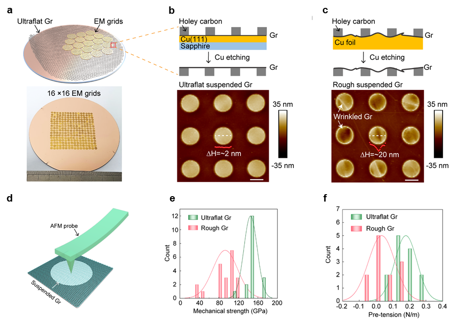 图2 超平整石墨烯载网的设计、制备与力学性质表征