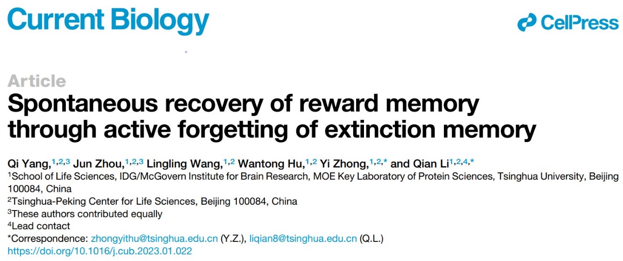 此部分研究工作于2023年2月1日在线发表于《当代生物学》(Current Biology)杂志,题为“奖赏记忆的自发回复源于消退记忆的主动遗忘”(Spontaneous recovery of reward memory through active forgetting of extinction memory),发现奖赏记忆的消退之所以会随着时间自发回复,是因为消退产生了一种会发生主动遗忘的反向记忆。这种主动遗忘是由Rac1/Dia分子通路介导的,用遗传学或者药理学的方法阻断此通路可以有效阻止自发回复现象的产生。