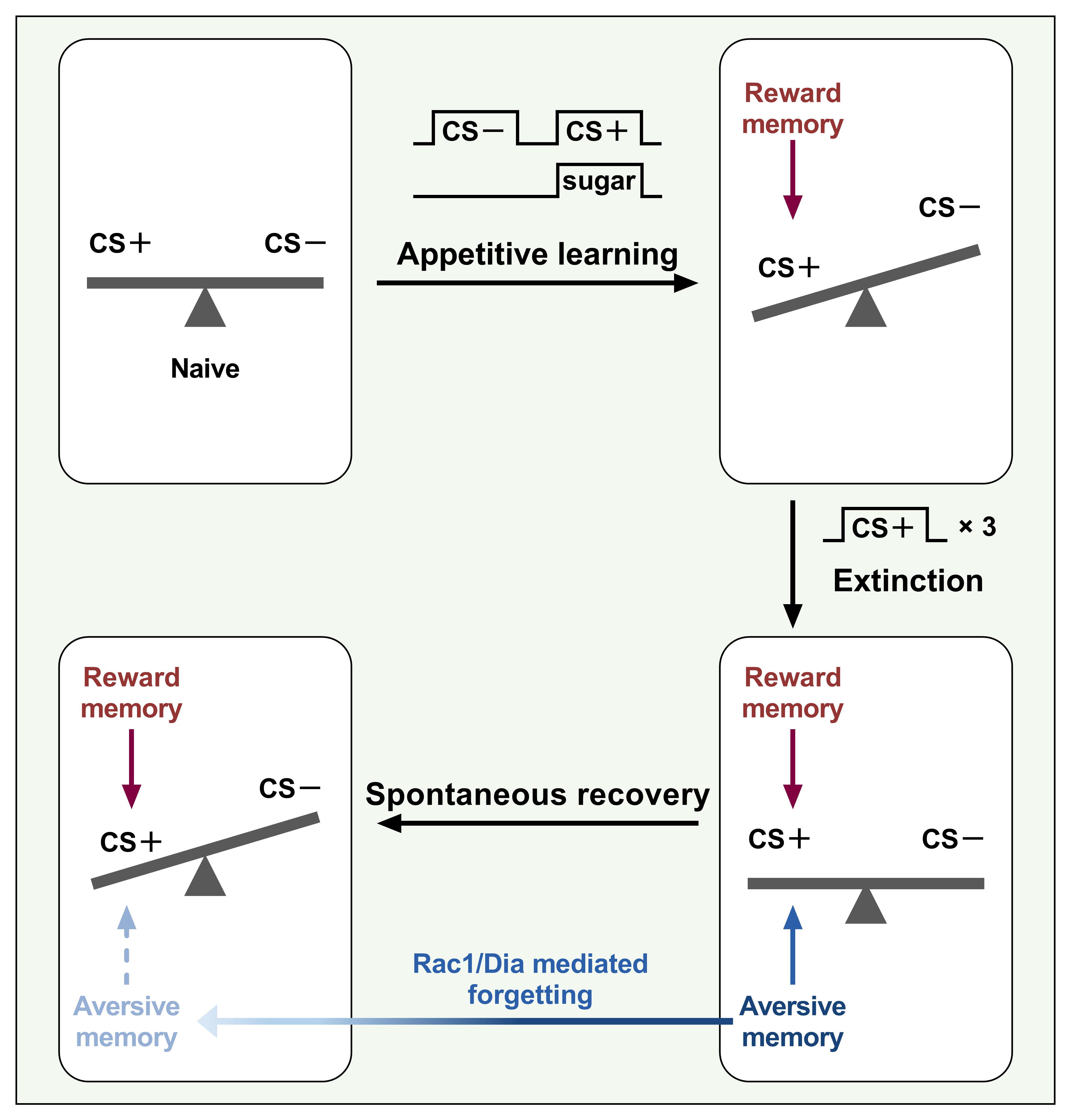 小小的果蝇在历史上已经多次帮助研究者们理解了很多大问题,比如遗传学规律、胚胎发育机理、先天免疫机制和生物昼夜节律等。利用果蝇研究学习记忆相关问题已经有近50年的历史。钟毅课题组于2010年发表在《Cell》杂志的文章首次发现惩罚性记忆的遗忘是主动发生的,并通过一种叫Rac1的分子来具体调控(Shuai, et al., Cell, 2010)。2019年课题组发现Rac1对主动遗忘的调控是通过SCAR/Dia分子通路来具体执行的(Gao, et al., PNAS, 2019)。近些年,英国牛津大学Waddell课题组发表在《Nature》杂志的文章表明果蝇奖赏记忆的消退可能产生了一种惩罚性的反向记忆(Felsenberg, et al., 2017)。基于这些发现,研究者猜测奖赏记忆消退后的自发回复现象可能是由于消退记忆发生了主动遗忘造成的。