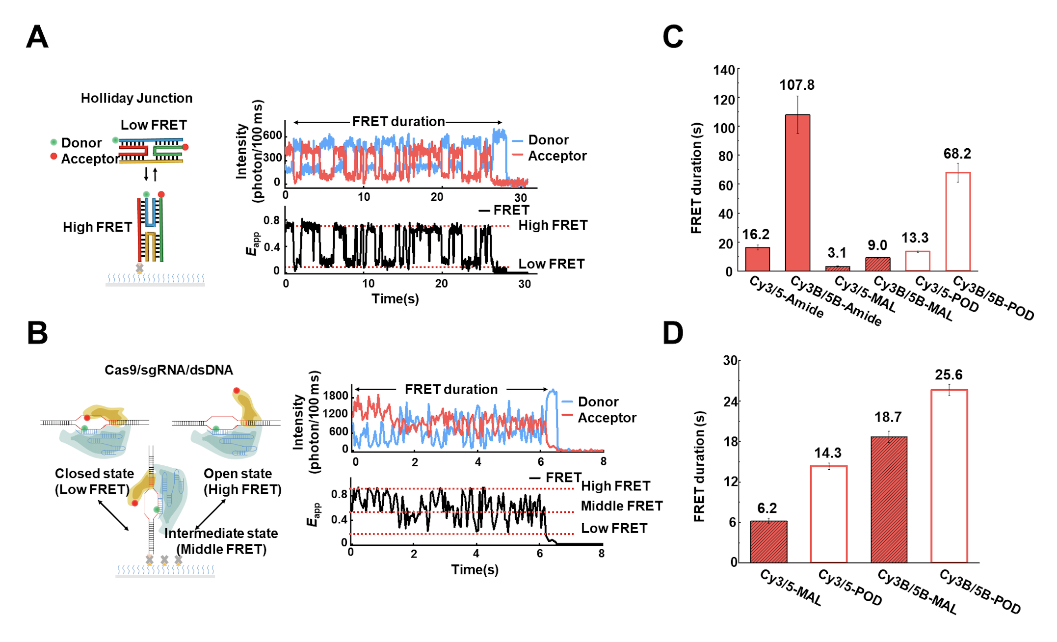 近二十年来,基于荧光显微镜和荧光染料技术的迅速发展,科学家们能够以前所未有的时空分辨率来观测生物分子的位置、动态与功能。大多数荧光成像技术,如单分子荧光共振能量转移(smFRET),单分子追踪,单分子定位显微镜(SMLM),受激辐射损耗(STED)显微镜和MINFLUX显微镜,对于染料一个核心诉求便是让每个荧光团分子在光漂白前发射出更多的光子,即提高荧光染料的光稳定性,以实现长时程、高时空分辨率的成像。