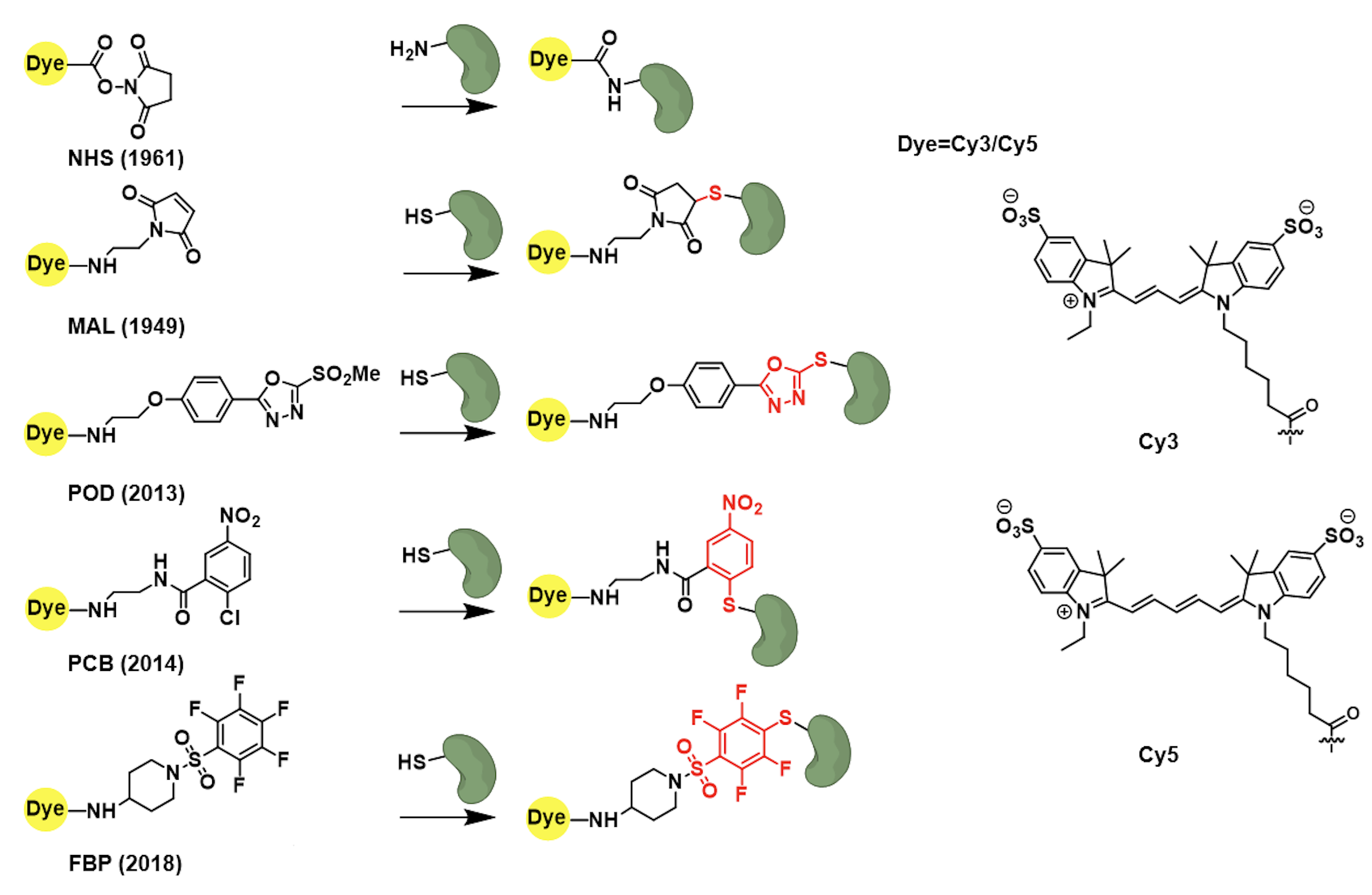 在荧光显微成像时,往往需要将染料精确特异地标记在目标生物分子,甚至特定的标记位点上。迄今为止,与氨基反应的琥珀酰亚胺(NHS)酯和与巯基反应的马来酰亚胺(MAL)是两个最常用且广泛商业化的标记模块,用于将有机荧光团共价连接到目标生物分子上。通常,NHS-氨基的化学被用于位点特异性地标记核酸和非特异性地标记蛋白质,这是因为含有氨基的赖氨酸残基在蛋白质中丰度较高。而含有巯基的半胱氨酸在蛋白质中的丰度较低,因而可以通过蛋白定点突变移除内源性的半胱氨酸并在标记位点引入半胱氨酸,利用MAL-巯基标记化学实现蛋白质上的位点特异性标记,这一标记方法在单分子荧光和单分子FRET技术中的应用尤为广泛和重要。