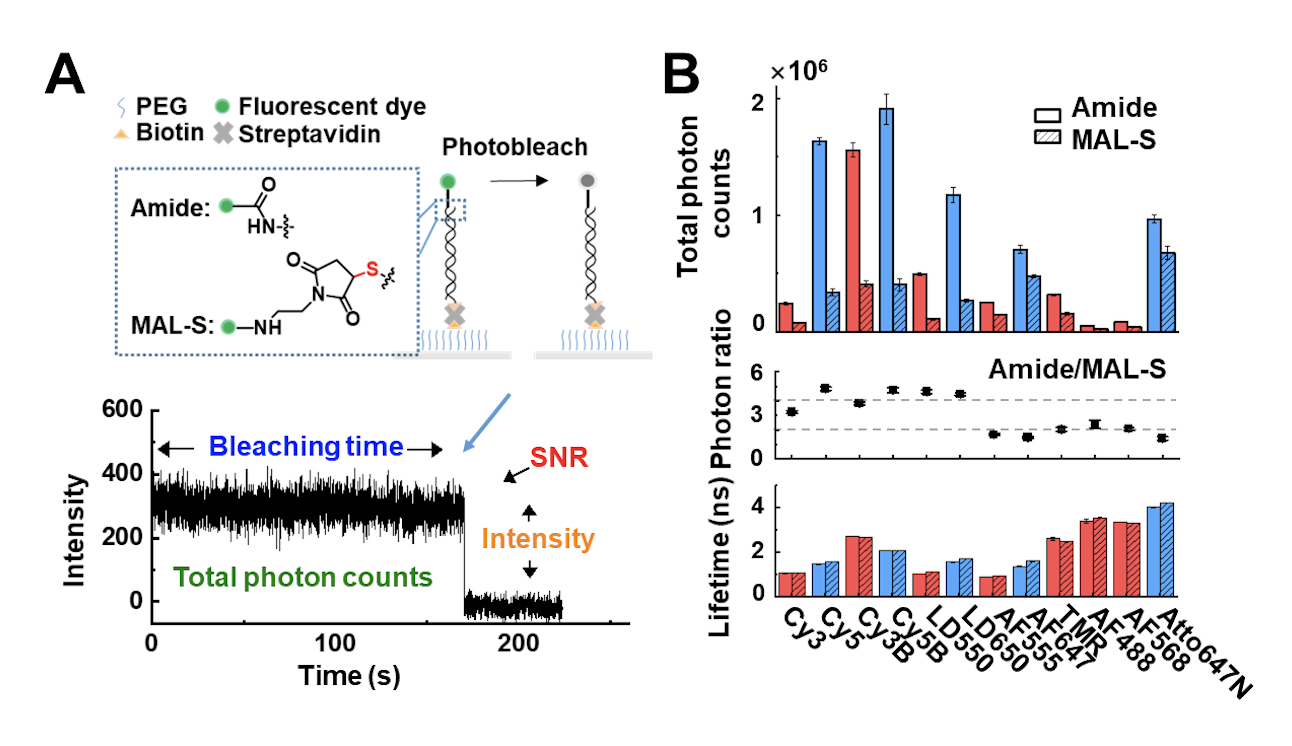 单分子荧光领域的研究者们发现通过MAL-巯基标记在蛋白上的荧光团的光漂白速度要比相同的标记在DNA上的荧光团显著加快。长期以来,人们将这一现象归于蛋白质上复杂的微环境加速了荧光团的光漂白。但八年前(2015年)陈春来课题组在实验中意外发现,即便是标记在相同序列DNA链上的相同荧光团分子,仅是NHS-氨基和MAL-巯基标记化学的差异,就会显著影响荧光团的光学特性和光漂白(图1)。进一步的测试发现,这一现象广泛存在于各类染料之中,无论母体是罗丹明类(Rhodamine)还是花青(Cyanine)类染料都会因MAL标记方式而造成约2-5倍不等的光稳定性下降(图1)。基于结果猜测,MAL标记形成的高活性的硫醚基团加速了染料的光漂白。