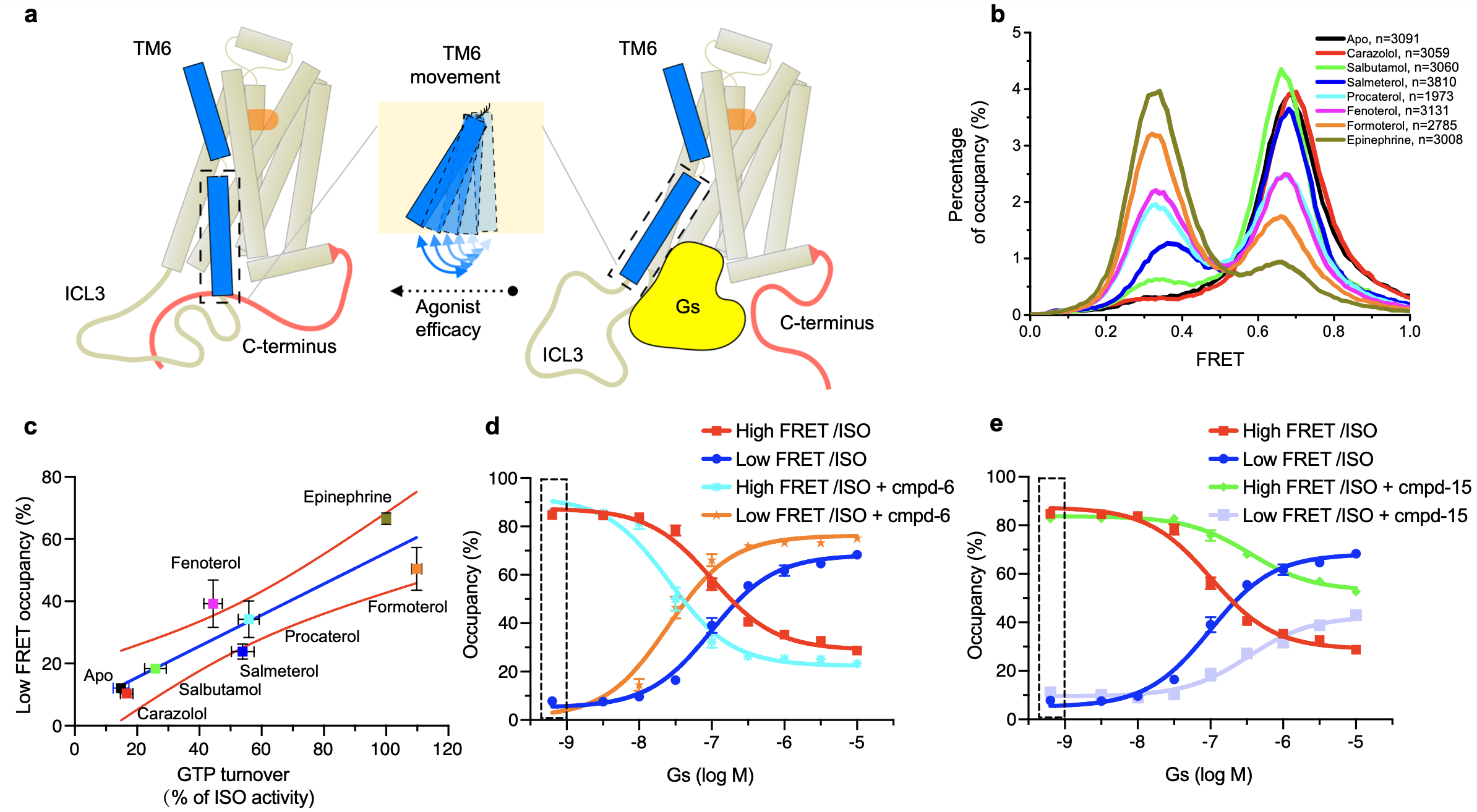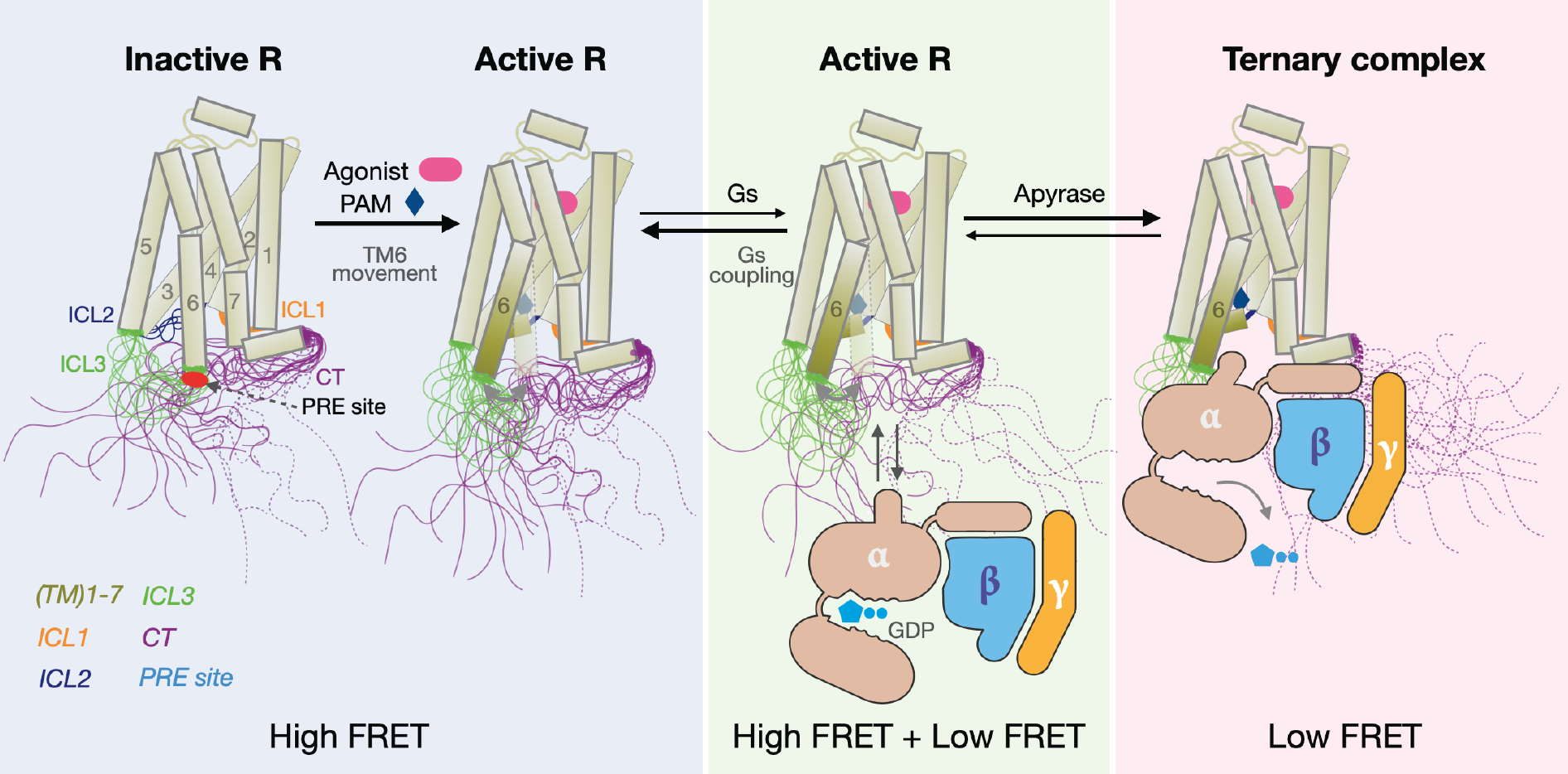 随后,研究人员利用单分子荧光共振能量转移方法,对受体的跨膜区和C末端进行特异性的荧光标记,从而研究受体被激活过程中受体C末端的构象变化。结果显示,单独的受体呈现均一的高FRET状态,当受体与激动剂、Gs蛋白形成传递信号的三元复合物后,受体移动到低FRET状态,暗示受体C末端发生较大的构象变化。进一步研究表明,不同类型的正构配体,能够不同程度的稳定受体-激动剂-Gs蛋白三元复合物。通过单分子荧光共振能量转移技术获得的蛋白复合物的动态性质数据,与蛋白水平的活性研究以及传统细胞水平研究方法获得的正构配体效用(efficacy)数据相吻合。除此之外,单分子荧光共振能量转移方法证实,正向别构调控剂或反向别构调控剂也能对受体-激动剂-Gs蛋白三元复合物的动态性质产生特定的影响,也是通过调节Gs 偶联并形成三元复合物的稳定性。