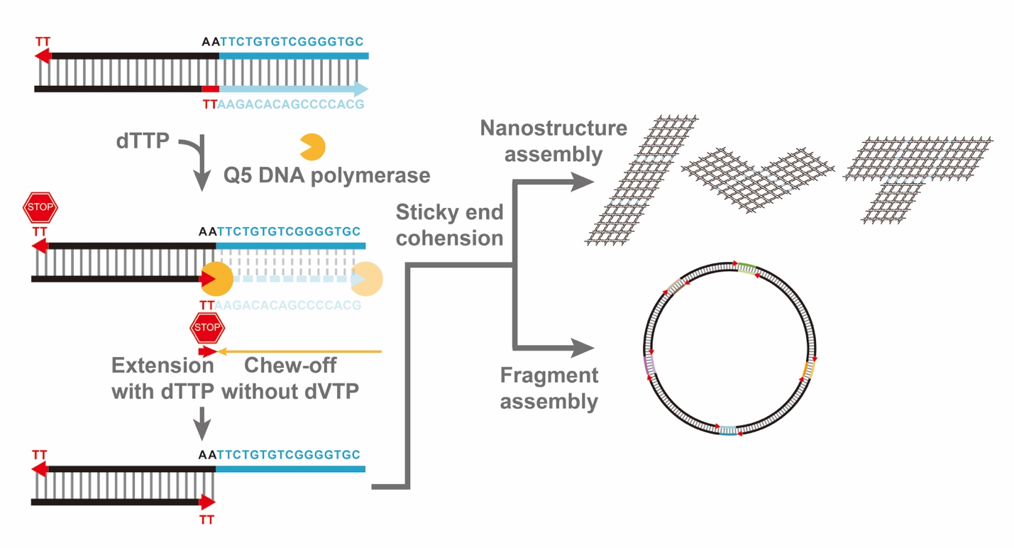 运用这种思路,本研究报道了一种酶促组装具有重叠片段的DNA高级结构和双链片段的方法。本研究的设计引入了一种具有3’至5’外切酶活性的DNA聚合酶(Q5 DNA聚合酶)来产生单链DNA粘末端,以实现特定的粘末端互补配对。通过精心的序列设计,Q5 DNA聚合酶的外切酶活性可以在只存在dTTP (不含有dATP、dCTP和dGTP)的情况下,消化预定序列3’末端只含有A,C和G核苷酸的部分。当酶作用到T核苷酸的位点时,由于体系中dTTP的存在,聚合酶活性会发挥作用,与外切酶活性进行一场“拔河”拉锯,从而使得消化作用被终止在特定位点。