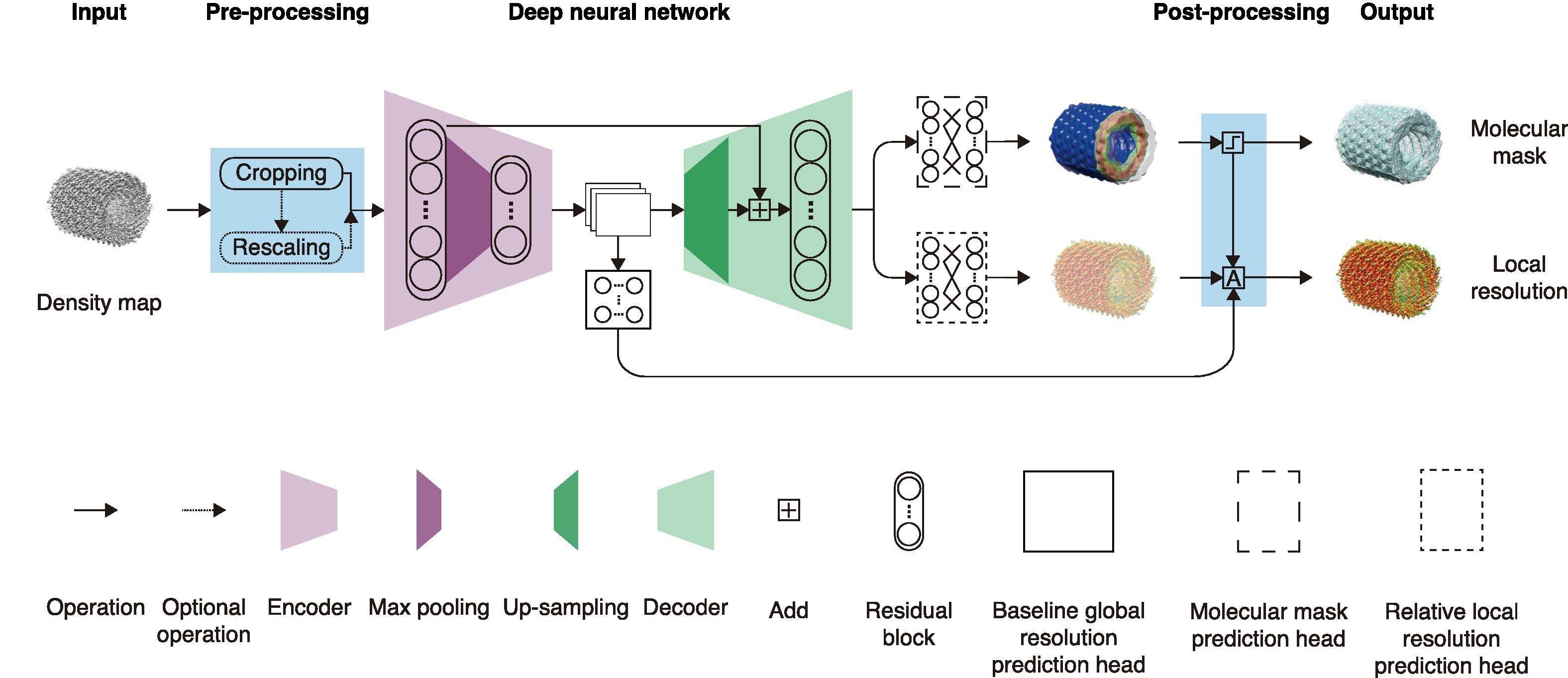 冷冻电镜已成为解析生物大分子结构的最主要技术之一。在冷冻电镜密度图的质量评估中,一个关键的指标是分辨率,即可以通过一致性测试的最精细结构细节的大小。由于样品异质性和辐射损伤等因素的影响,冷冻电镜密度图在不同区域的分辨率是可以不同的;因此,研究者因此引入了局部分辨率的概念。快速、准确、有效地评估冷冻电镜密度图的局部分辨率可以为三维重构和下游结构分析提供指导。目前可用的局部分辨率估计方法存在一些限制,比如需要人工进行参数调整、耗时较长,以及在某些情况下需要以半折密度图(half map)作为输入,无法对单个密度图估计局部分辨率等。