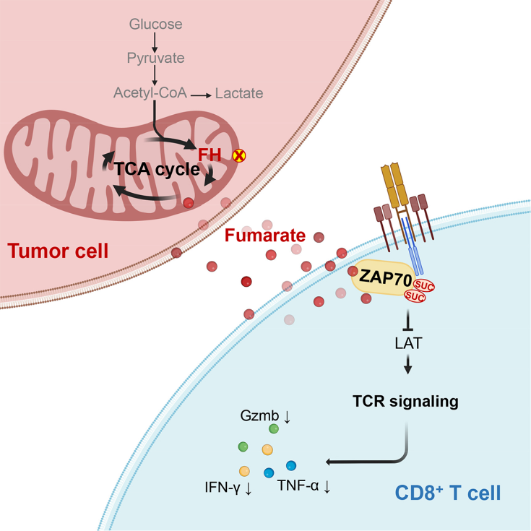 图1. 肿瘤细胞通过积累延胡索酸,抑制ZAP70-TCR信号通路,阻断CD8+ T细胞的抗肿瘤功能