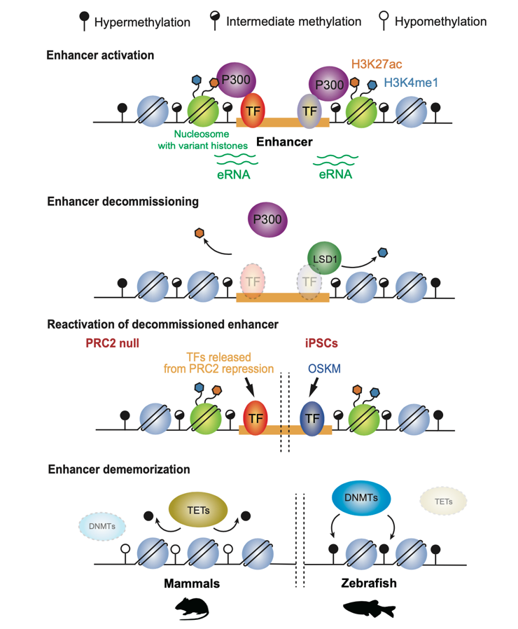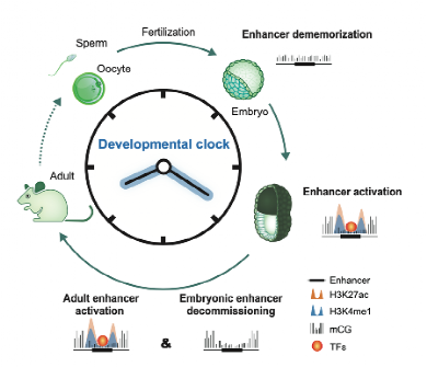 增强子的沉默(Enhancer silencing)包括增强子失活(Enhancer decommissioning)和增强子去记忆化(Enhancer dememorization)。其中,失活的增强子会失去转录因子的结合、丢失大部分组蛋白修饰,但是通常会保留低DNA甲基化状态。这些低DNA甲基化修饰作为“转录化石(Transcriptional fossil)”能够记录增强子曾经活跃过的信息。最终,这种低DNA甲基化的状态会在增强子去记忆化的过程中被擦除。增强子的去记忆化则通常特异地发生在亲本-合子转化期(包括配子生成和早期胚胎发育阶段),其主要目的是擦除亲本表观记忆,便于胚胎建立子代的表观图谱。随后,去记忆化的增强子进入新一轮的生命周期。