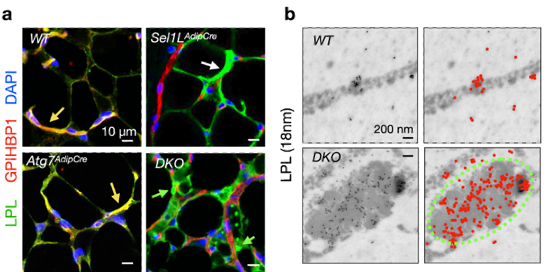 图3 – 使用免疫荧光实验在共聚焦显微镜下观察到,在野生型(WT)和自噬单敲(Atg7AdipCre)的小鼠中,LPL可被脂肪细胞分泌并进入血管中,从而与血管标记蛋白GPIHBP1共定位(a,黄色箭头); 然而在SEL1L-HRD1 ERAD单敲(Sel1LAdipCre)和ERAD与自噬双敲(DKO)的小鼠中, LPL累积在脂肪细胞中从而不能被正常分泌到血管中(a, 白色箭头)。相比于SEL1L-HRD1 ERAD单敲(Sel1LAdipCre),在双敲小鼠(DKO)中,LPL不仅在脂肪细胞中累积,大部分且形成圆形焦点(a, 绿色箭头)。使用免疫金染色特异标记LPL后,可在TEM下观察到LPL在双敲脂肪细胞中富集于CERFs结构 (绿色虚线)中(b)。