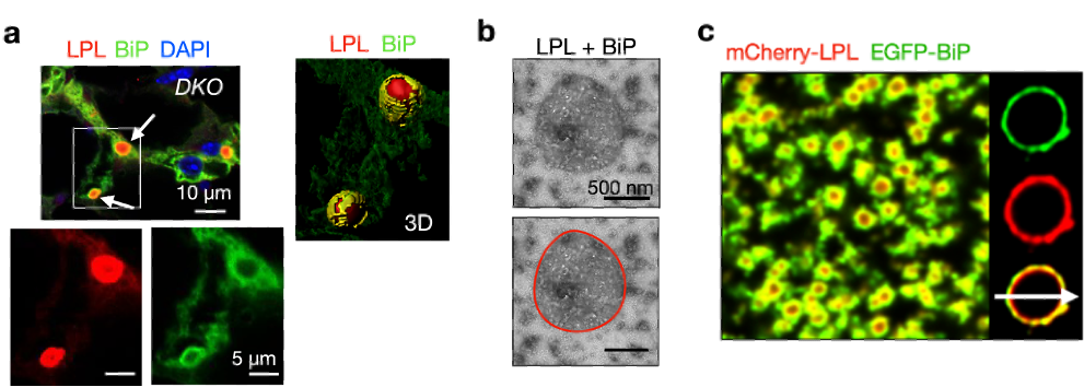 图4 – 使用免疫荧光实验在共聚焦显微镜下观察到,在ERAD与自噬双敲的小鼠(DKO)脂肪组织中,LPL CERFs的外围被BiP 环绕 (a,箭头)。负染色后,在TEM下观察到纯化BiP与LPL一起相分离(b)。荧光染色后,发现纯化的BiP包裹LPL液滴(c)。