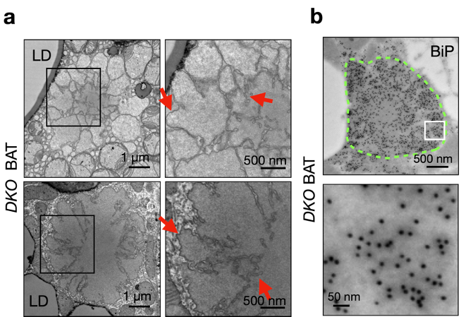图2 – 透射电子显微镜(TEM)下观察到在脂肪细胞特异SEL1L-HRD ERAD 和ER-phagy 双敲除(DKO)的小鼠的脂肪组织里形成的CERFs结构 (a, 箭头:在CERFs中的类膜结构)。使用 免疫金染色后,在TEM下观察到CERFs结构 (绿色虚线) 富集着内质网腔标记蛋白BiP (b)。 LD: lipid droplet.