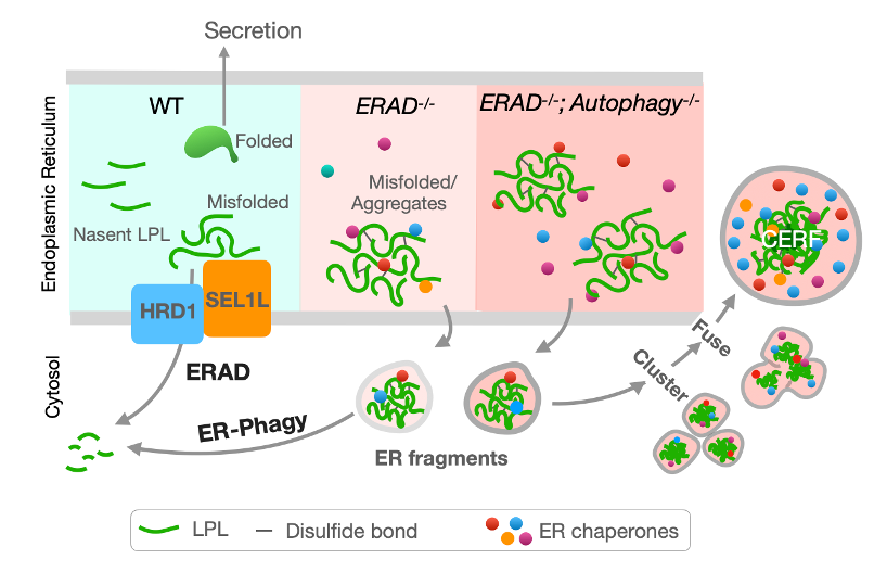 细胞通过各种不同的蛋白质量控制机制(Protein Quality Control Mechanisms)防止有害蛋白聚集。 这些蛋白质量控制机制的退化或故障导致众多人类疾病,如糖尿病、癌症,和各种老年疾病等。内质网作为蛋白质折叠和质量控制的主要场所,利用内质网蛋白降解 (ERAD) 和内质网自噬 (ER-phagy)两种机制降解错误蛋白。其中ERAD 有针对性地降解内质网中的蛋白,而ER-phagy,作为自噬 (autophagy) 的一种,常被认为批量降解已碎片化的内质网或内质网域 (ER fragments/domains)。 然而,作为两种最重要的蛋白降解机制, 我们对ERAD和ER-phagy的作用机制,尤其是在生理条件下二者如何协同并维护内质网稳态仍知之甚少。