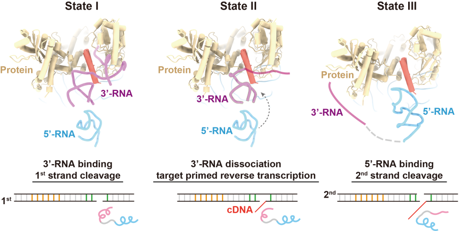 此外,课题组用一段连接序列将5’-RNA与3’-RNA连接成一条RNA,设计了R2全长mRNA的模拟物(L-RNA),并获得了R2逆转座子在L-RNA结合状态的结构。在这个结构中,5’-RNA同样以“三爪”的形式与蛋白质核心紧密结合,但由于3’-RNA的挤占,起激活第二条链切割作用的Claw3未能与RB结构域结合。课题组发现,L-RNA中3’-RNA与蛋白质RB结构域的结合将抑制第二条链的切割,但当提供dNTP作为原料,使逆转录可以发生后,3’-RNA在作为逆转录模板的过程中逐渐从RB结构域上解离下来,5’-RNA得以与RB结构域结合,从而激活第二条链的切割。