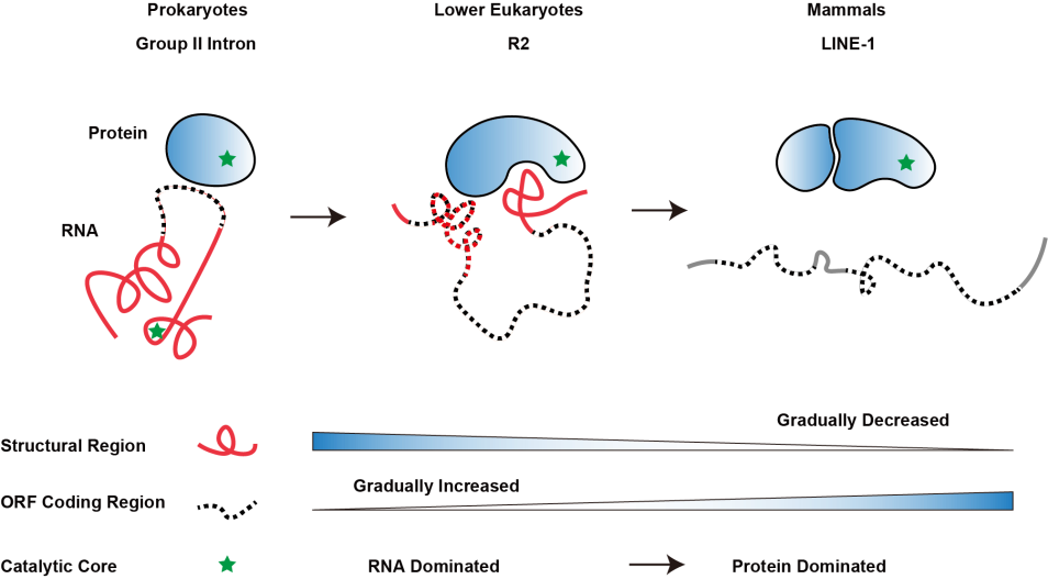 有趣的是,课题组将低等真核生物的R2逆转座子与其祖先(原核生物第二类内含子,Group II intron)和哺乳动物中的LINE-1逆转座子进行了比较,发现在Group II intron向R2逆转座子及进一步向LINE-1逆转座子进化的过程中,RNA的结构性组分逐渐减少并被编码区域所取代,并且催化功能逐渐从以RNA为主导过渡到以蛋白质为主导,为理解生物大分子进化提供了新的视角。此外,LINE-1逆转座子在哺乳动物基因组中广泛存在且具有逆转座活性,为基因组提供进化驱动力的同时,也为基因组稳定性和基因表达带来了重大的影响。对R2逆转座子在基因组上跳跃的分子机制的研究,将启发我们思考LINE-1逆转座子这类“自私的基因”与基因组之间精彩的博弈过程。