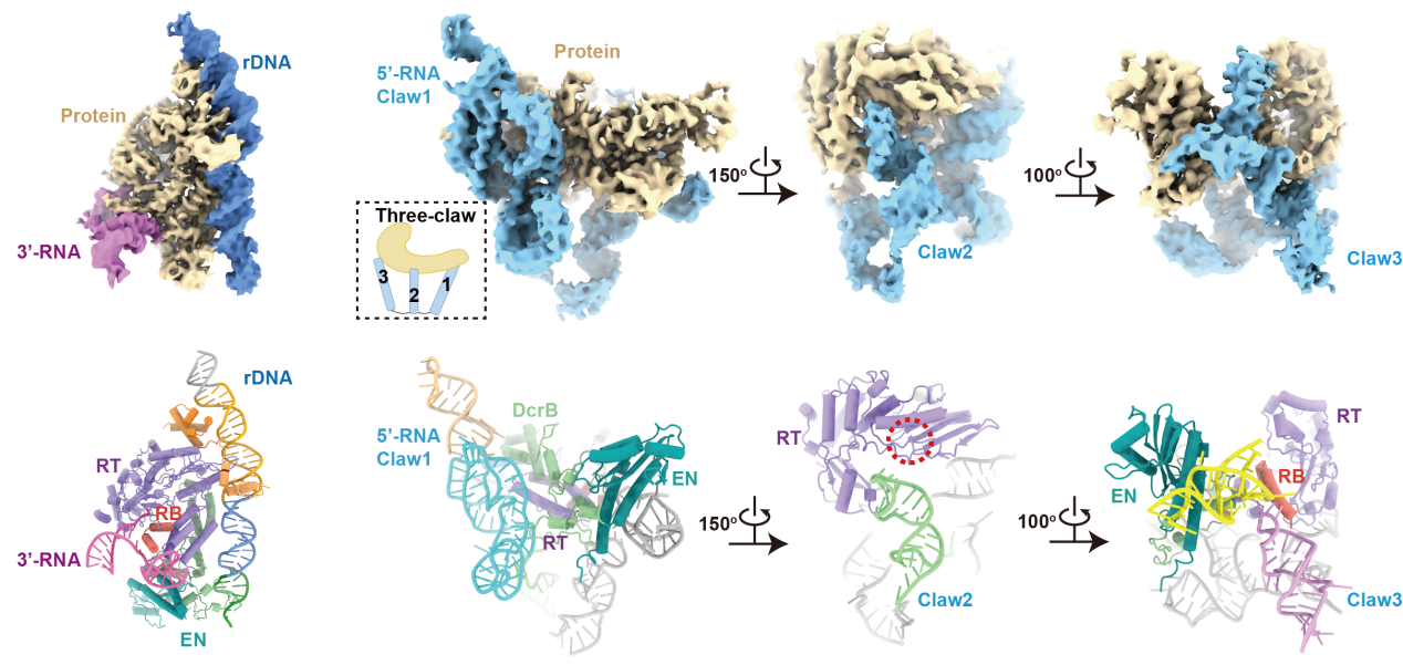 课题组发现, 位于R2 mRNA 3’端非翻译区的RNA(3’-RNA)在R2蛋白质切割DNA双链的过程中,表现出促进第一条链切割、抑制第二条链切割的作用;位于5’端翻译区的RNA(5’-RNA)则表现出降低第一条链切割、激活第二条链切割的作用;而当5’-RNA与3’-RNA同时存在时,总是表现出3’-RNA的调控作用,并且完全抑制第二条链的切割。为了进一步理解其中的分子机制,课题组解析了R2逆转座子在3’-RNA结合状态和5’-RNA结合状态的高分辨结构。在3’-RNA结合状态中,DNA底物被蛋白质特异性识别,3’-RNA核心区域结合在蛋白质的RNA结合(RNA binding, RB)结构域上。在5’-RNA结合状态中,5’-RNA呈现出复杂的“三爪(three-claw)”结构,紧密的包裹住蛋白质核心。值得注意的是,5’-RNA的其中一个爪(Claw3)同样结合在RB结构域上,且生化分析表明,Claw3对激活第二条链切割是必要的。