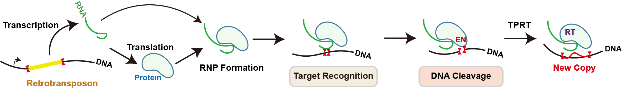 有趣的是,逆转座子等可移动的DNA元件在基因组上跳跃的过程中,极大地丰富了基因组的组成,被认为在基因组进化的过程中扮演着重要的作用。因此,理解逆转座子在基因组上跳跃的分子机制将有助于思考“我们的基因组从哪里来、如何来”的问题。此外,利用逆转座子在基因组上跳跃的性质,开发新的核酸操纵工具,将具有巨大的应用前景(Science, 2023)。