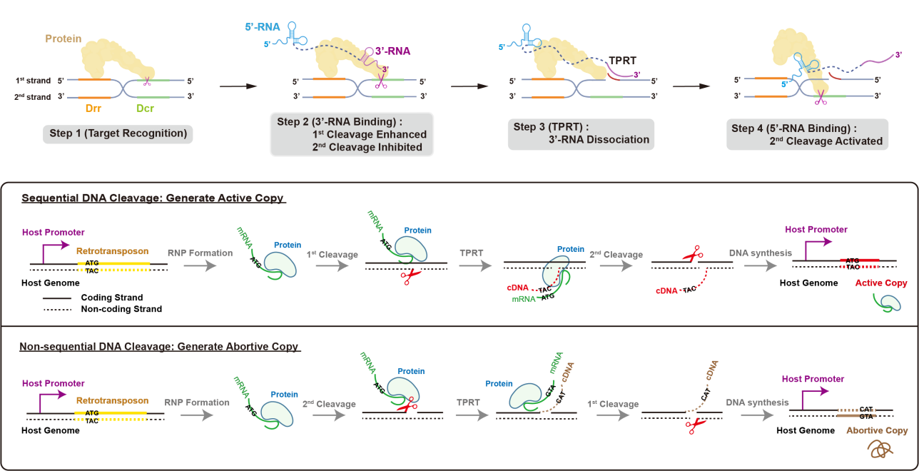 综合以上分析,课题组总结得出了R2逆转座子在基因组上跳跃的分子机制:R2蛋白质特异性识别28S核糖体DNA序列后,蛋白质RB结构域首先结合R2 mRNA上的3’-RNA,促进第一条DNA链的切割,同时抑制第二条链的切割,仅暴露出第一条链的3’-OH作为引物,从mRNA的3’端起始逆转录过程(Target-primed reverse transcription, TPRT),随着逆转录的进行,位于mRNA 3’端的3’-RNA逐渐从蛋白质RB结构域解离,对第二条链切割的抑制作用得以释放,R2 mRNA上的5’-RNA与RB结构域的结合进一步激活了第二条链的切割。由此,位于mRNA两端的结构性RNA共同监督了DNA双链的顺序性切割。这种严密的顺序性切割保障了依赖宿主基因表达元件的R2逆转座子进行“有效的增殖”,从而在28S核糖体DNA中不断产生有活性的拷贝。