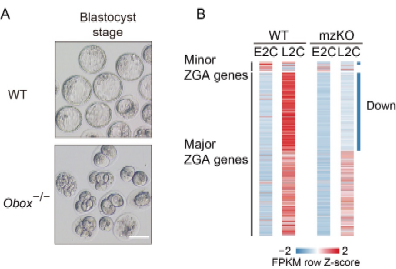图1. Obox家族敲除导致胚胎2-4细胞阻滞和合子基因组无法正常启动。