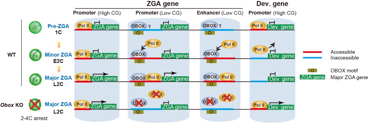 图2. OBOX帮助RNA聚合酶II结合到正确靶基因上,保证ZGA正常进行。