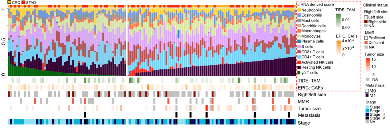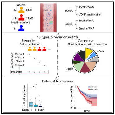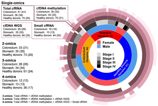 在该研究中,研究人员利用2-3毫升血浆中的cfDNA 和cfRNA,对80位结肠癌和胃癌患者以及81个健康对照的血浆样本进行了4种不同组学水平的检测,包括基因组(cfDNA)、表观基因组(cfDNA 甲基化)、小 RNA(small cfRNA)和全 RNA(total cfRNA)转录组(图1 左)。研究人员基于以上多组学数据进行生物信息学分析,对衍生出的10余种不同类型的变异事件分别进行了整合、比较。