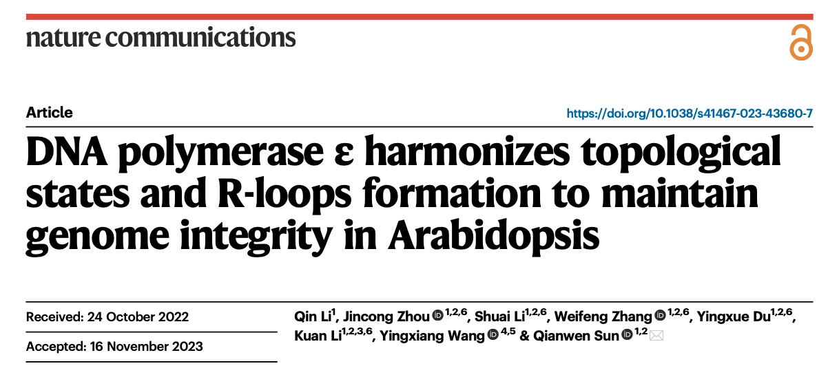 2023年11月27日,best365中国官方网站生命学院孙前文实验室在《自然·通讯》(Nature Communications) 期刊上发表了题为 “DNA聚合酶ε协调基因组拓扑状态和R-loop 的形成以保持拟南芥基因组的完整性” (DNA polymerase ε harmonizes topological states and R-loops formation to maintain genome integrity in Arabidopsis) 的研究论文,揭示了拟南芥中DNA聚合酶ε 参与调控topoR-loop动态变化和 DNA复制进程,进而维持基因组完整性的分子机制。
