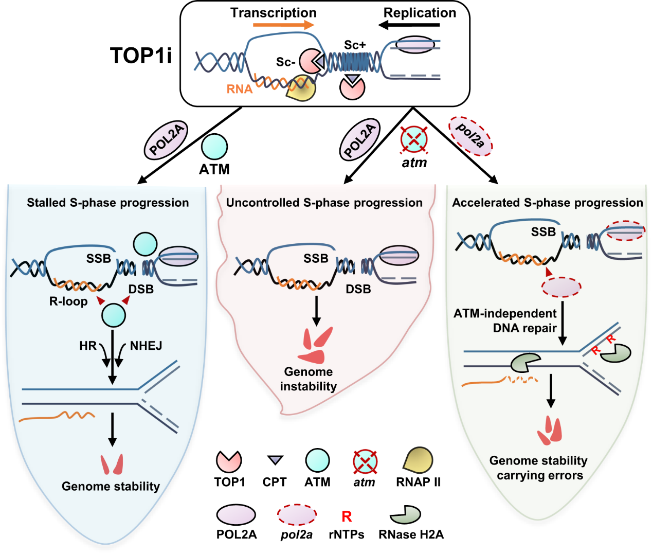 作者首先在拟南芥中应用TOP1抑制剂(TOP1i, TOP1 inhibitor)建立了一个反映R-loop水平与基因组拓扑状态的监测系统,发现CPT处理可显著促进根尖组织中基因组R-loop(拓扑结构发生改变导致的R-loop变化,简称为topoR-loop)水平和DNA断裂标记γH2AX水平的升高,并最终抑制根生长。利用CPT进行反向遗传筛选发现DNA损伤修复激酶ATM的突变对CPT尤其敏感,基因组R-loop水平积累尤为显著,根的生长受到严重抑制。在atm突变体基础上利用该系统筛选鉴定出负责先导链合成的DNA聚合酶ε催化亚基POL2A的突变,可恢复atm中TOP1i诱导的topoR-loop积累和DNA损伤。深入研究发现pol2a可抑制DNA复制起始位点附近topoR-loop的积累,并降低CPT处理后正在进行DNA复制的细胞中的DNA损伤水平。该研究表明,DNA聚合酶ε可响应基因组拓扑结构变化,协同调控R-loop动态变化和DNA复制进程,从而维持基因组的完整性。该发现对深入理解人类癌症化疗过程中ATM缺陷导致TOP1i靶向药物耐药性的机制提供了重要信息,同时为联合使用DNA损伤药物和分层治疗提供可能的新策略。