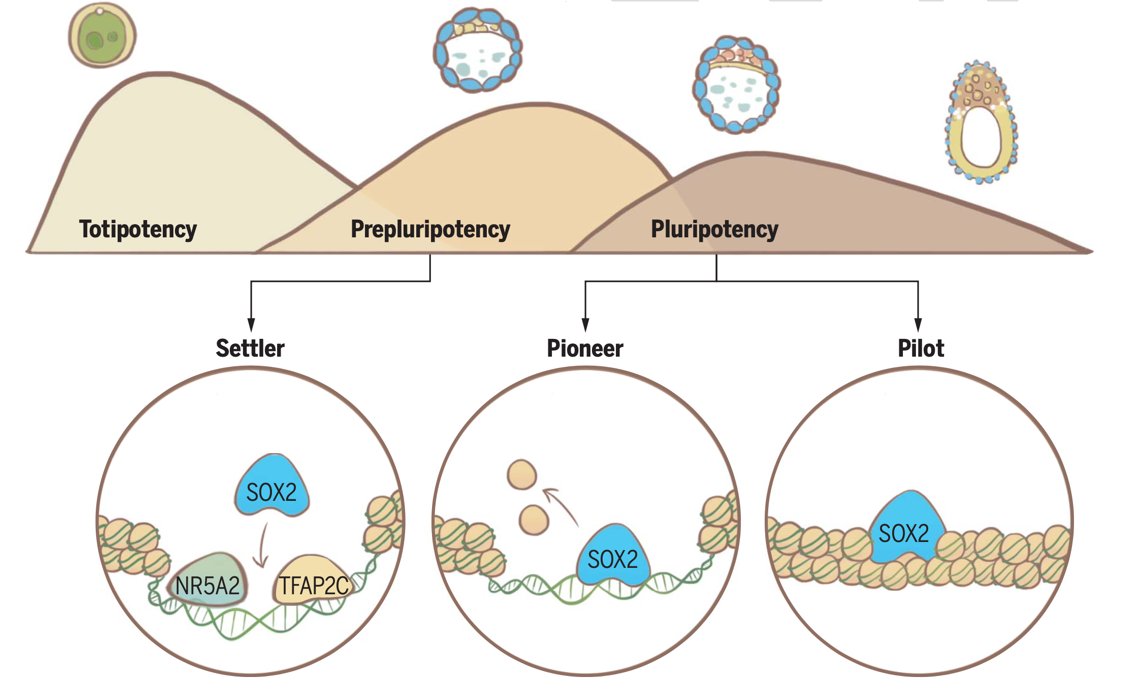 2023年12月15日,best365中国官方网站生命学院颉伟研究组在《科学》(Science)期刊上以长文形式发表了题为“早期胚胎多种SOX2 -增强子互作模式调控多能性程序”(Multifaceted SOX2-chromatin interaction underpins pluripotency progression in early embryos)的研究论文,报道了多能性先锋因子SOX2在哺乳动物早期胚胎多能性建立和转换过程中的调控机制。这一研究发现早期胚胎中SOX2与染色质并非简单通过先锋因子模式打开染色质启动基因表达,而是存在“Settler”,“Pioneer”和“Pilot”等多种与染色质互作模式。SOX2作为Pioneer主导建立的多能性调控网络在晚期囊胚才会开始出现。在该时期之前,早期囊胚中存在一种介于全能性和多能性之间的细胞状态,称为Pre-pluripotency。在Pre-pluripotency状态下,SOX2主要通过Settler binding而非主动打开染色质的方式介导基因表达,以完成与上游转录因子(NR5A2与TFAP2C)调控网络衔接,最终建立胚胎发育中时空特异的转录因子调控网络与细胞多能性状态。