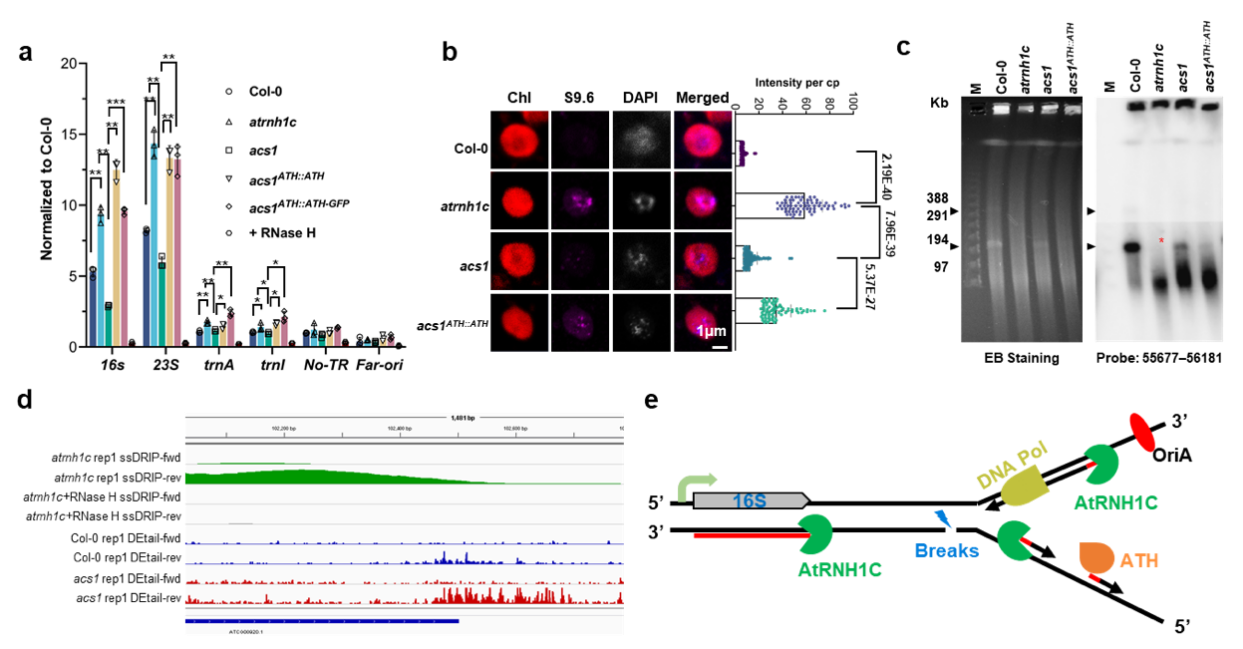 在acs1突变体中,ATH蛋白的一个跨物种间高度保守的氨基酸发生替换,导致蛋白与DNA模板的结合能力变弱,合成RNA引物以及介导DNA复制酶合成DNA的能力下降,从而减缓了转录-复制对撞和R-loop积累,使得atrnh1c突变体的表型缺陷发生一定程度的恢复(图2a-c)。通过链特异性的DNA断裂测序发现,在叶绿体基因组中高转录复制对撞的rDNA区域,转录和后随链的复制在同一条DNA链上进行,这条链的转录本末端存在特异且较高程度的单链DNA断裂(图2d和e)。通过构建叶绿体DNA复制酶Pol1A与AtRNH1C的双突材料1cpol1a,进一步验证了减缓复制可以减轻转录-复制对撞和R-loop积累,从而维持基因组稳定,恢复atrnh1c突变表型。
