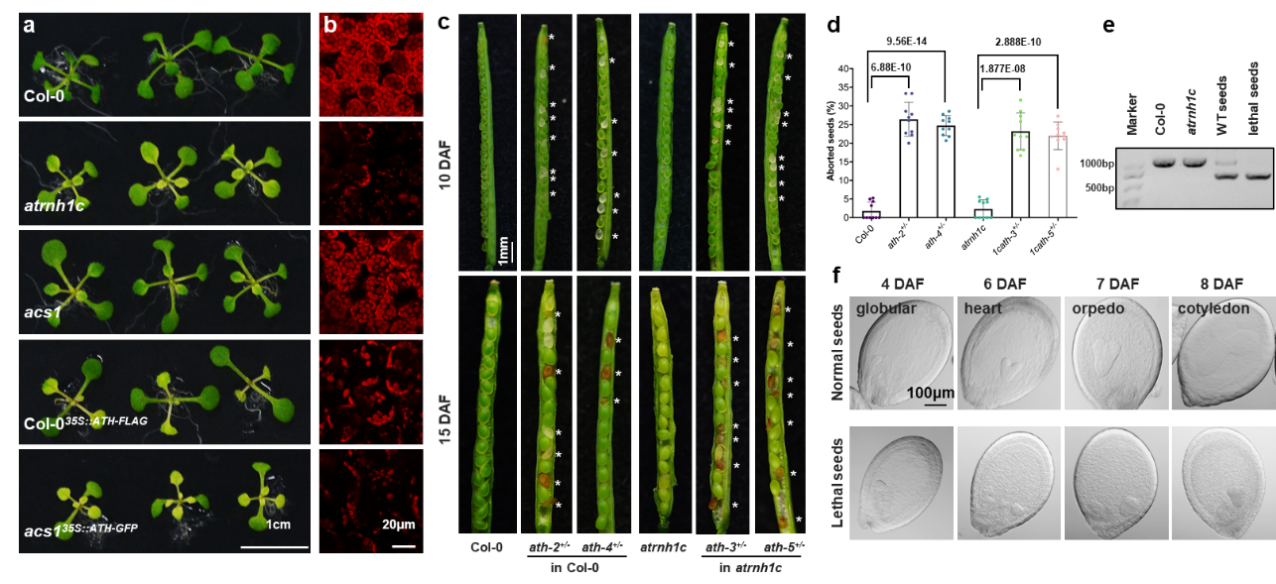 为进一步探究参与基因组稳定性和R-loop调控的新因子,孙前文实验室对atrnh1c突变体进行EMS诱变筛选,获得多个表型抑制突变体。其中acs1(atrnh1c suppressor 1)突变体无论是叶片颜色,光合效率,以及叶绿体的数目和形态,与atrnh1c相比均有显著恢复(图1a和b)。通过基因定位和功能验证鉴定到ACS1基因编码一个叶绿体和线粒体双向定位的引物酶ATH(图1c-f)。引物酶在DNA复制过程中合成小的RNA片段,引导合成新的DNA链。