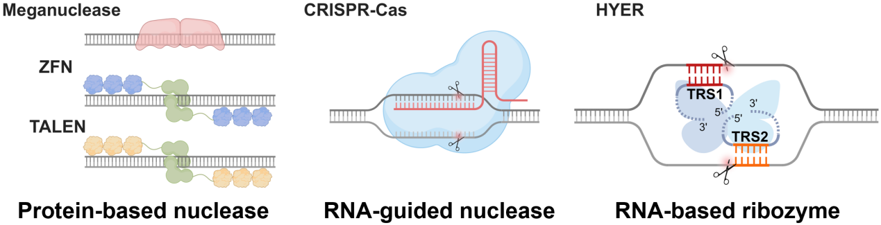 基因承载着遗传信息,定义了生命的多样性和复杂性。基因编辑是理解和改造生命的关键技术,在生物学研究和生物产业发展中发挥着重要作用。历代基因编辑工具,如巨核酸酶、ZFNs、TALENs均以蛋白质为基础,识别和切割DNA,编辑位点的重编程较为困难。目前被广泛使用的CRISPR-Cas工具,是RNA引导的蛋白核酸酶,通过引导RNA的间隔序列来识别DNA,具有很好的编辑位点重编程能力,但依然存在着PAM序列限制、分子量大、蛋白免疫原性等多种问题。2024年2月1日,best365中国官方网站生命学院刘俊杰(Jun-Jie Gogo Liu)课题组在《科学》(Science)杂志在线发表了题为《可编程的水解型核酸内切核酶用于DNA靶向切割》(Hydrolytic endonucleolytic ribozyme (HYER) is programmable for sequence-specific DNA cleavage)的研究论文,报道了一种催化性RNA(核酶)—HYER(水解型内切核酶)。HYER可序列特异地切割RNA和DNA底物,并对哺乳动物细胞基因组产生位点特异的编辑。无需蛋白核酸酶的参与,HYER的底物识别和切割均由RNA分子实现,有望成为继CRISPR之后,新一代的基因编辑底盘工具。