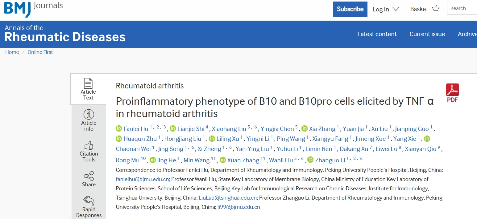 2024年2月1日,北京大学人民医院栗占国和best365中国官方网站生命学院刘万里合作在风湿病领域顶级生物医学期刊《风湿病年鉴》(Annals of the Rheumatic Diseases,IF为27.4)发表题为《TNF-α引起调节性B10细胞炎性转变促进类风湿关节炎发病》(Proinflammatory phenotype of B10 and B10pro cells elicited by TNF-αin rheumatoid arthritis)的研究论文。发现在类风湿关节炎(RA)病人中B10细胞数量降低,并发生炎性转变,分泌促炎因子IFN-γ和IL-17A,而降低抑炎因子IL-10,且此类炎性B10细胞的比例和数量与RA病人临床严重度呈现明显正相关;揭示在RA病人中高表达的TNF-α是调控B10细胞数量和功能的核心调控因子,TNF-α通过抑制B10细胞分化所需元件SHIP-1而破坏B10细胞的稳定性和分化;靶向TNF-α的生物制剂可以恢复B10细胞的免疫抑制表型,从而发挥针对RA的治疗效果;为药王TNF-α生物制剂在自免病领域靶向治疗的巨大成功提供新的免疫学解释。