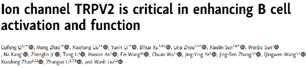抗体应答对于人类健康至关重要。B细胞受体(BCR)通过免疫突触内的协调性调控网络对抗原进行识别并启动B细胞的活化程序。已有的研究证实BCR可以有效地辨识抗原的多种化学和物理特征,这些超凡的辨识能力表明,存在多重复杂的机制来调节 B 细胞的活化和功能。在完成首要步骤的抗原和BCR结合后,B细胞会迅速启动阳离子流动应答,重塑一系列脂质和膜近端信号分子之间的静电相互作用。因此,跨膜离子微流动对于B细胞的激活至关重要,阳离子通道在这一过程中扮演着关键调节角色。瞬时感受器电位离子通道香草素受体家族(TRPV)作为非选择性阳离子通道,参与响应许多内源性和环境刺激,介导多种细胞类型的阳离子流入和膜去极化反应,在伤害感知、表皮分化和温度感知方面发挥着重要作用。然而,TRPV 通道在 B 细胞激活和随后的抗体反应中的功能知之甚少,因此探究TRPV通道在B细胞活化中功能和调控的机制有望为B细胞信号转导、免疫疗法及新型药物开发提供新的思路和方向。