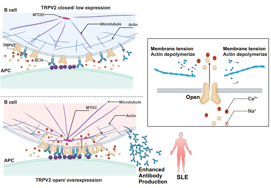 此项工作发现TRPV2是在B淋巴细胞中唯一高水平表达的TRPV家族成员,且在IgG-BCR型记忆性B细胞中的表达量最高,对于B细胞的免疫活化和功能至关重要。在生理方面,揭示TRPV2的表达水平与流感特异性抗体生成水平呈显著正相关,并且在B细胞缺失TRPV2小鼠中抗原特异性抗体产生显著缺陷,揭示了TRPV2在免疫反应和抗体生成中的关键调控作用;此外,该研究还发现TRPV2在新生儿、老年人群中的表达水平普遍较低,为这类人群免疫力低下提供了新的解释,并为针对性地提升疫苗保护效果开辟了新途径。在病理层面,研究发现B细胞中的TRPV2表达量与系统性红斑狼疮病人(成年和儿童)的疾病发展呈显著正相关。针对病人队列的更精细的B细胞亚群分析揭示,在系统性红斑狼疮病人和健康志愿者中,TPRV2表达量在Naïve B细胞亚群没有差别,而只有在记忆性B细胞亚群呈现极大差别;更重要的是经过临床药物治疗(例如类固醇、环磷酰胺、硫唑嘌呤、霉酚酸酯、羟氯喹、甲氨蝶呤、钙调磷酸酶抑制剂等)后,TRPV2表达量显著下降,这一发现不仅为治疗自身免疫疾病开辟了新的靶点和治疗策略,更凸显了TRPV2作为自身免疫疾病进展和预后的生物标志物的潜力。在机制方面,发现TRPV2主要通过阳离子通道孔结构域及N端-ANK结构域调控B细胞的膜电势及细胞骨架重塑来调控B细胞的活化。综上,该研究不仅阐明了TRPV2在调控B细胞活化及功能中的关键作用,还为未来提高疫苗效能、开发新的治疗靶点和生物标志物来治疗自身免疫疾病奠定了坚实的科学基础。