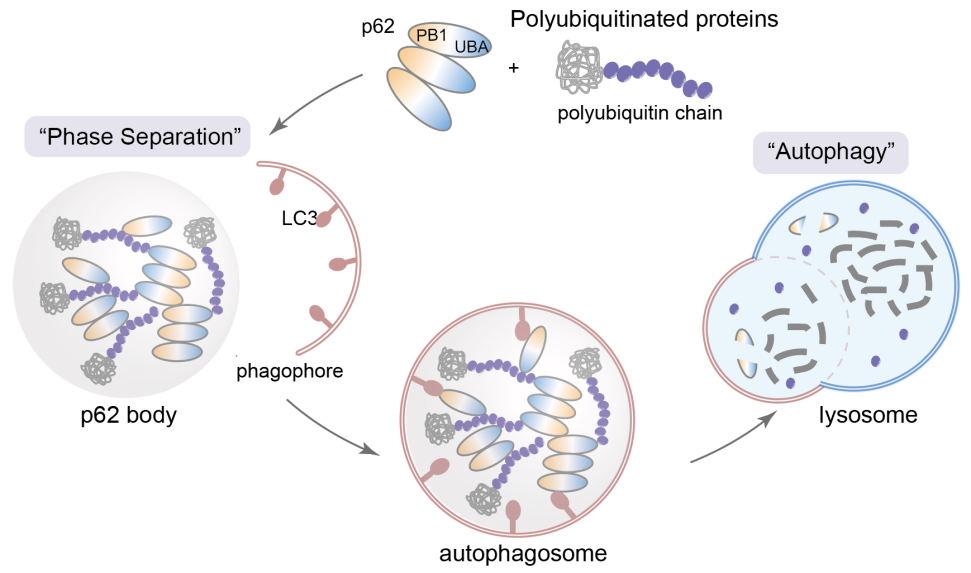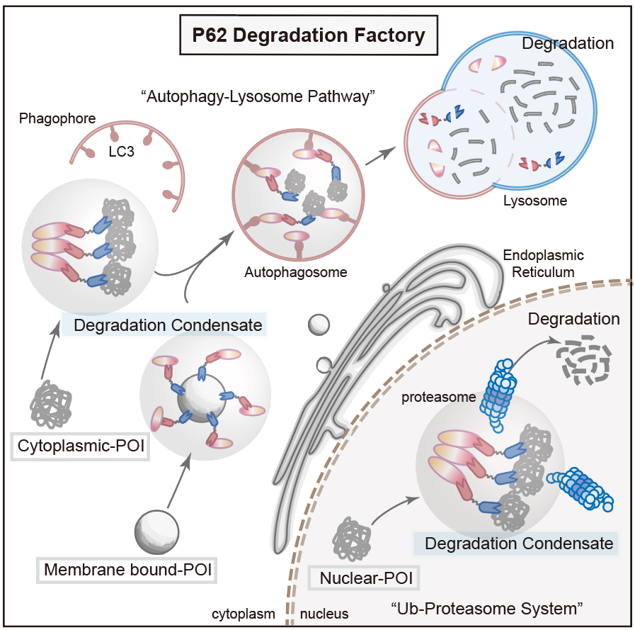 随着“液-液相分离”领域的蓬勃发展,越来越多的研究表明,在降解过程中的关键蛋白会通过液-液相分离形成“降解凝聚体”,这些凝聚体扮演着降解工厂的角色,将与降解相关的功能蛋白及待降解的底物富集在局部区室中,从而高效发挥降解功能。其中最具代表性的降解凝聚体是自噬受体蛋白p62与多聚泛素链形成的p62小体,它们为隔离膜的附着和延伸提供支点,并启动随后的自噬进程(图1)。此外,p62还参与到泛素-蛋白酶体相关的降解凝聚体中,成为蛋白酶体和自噬途径之间的桥梁。如果能特异性地将蛋白靶点招募至这些降解凝聚体中,将可能摆脱酶促反应的催化步骤(例如E3泛素连接酶的催化反应),直接通过空间距离的拉近实现有效降解。