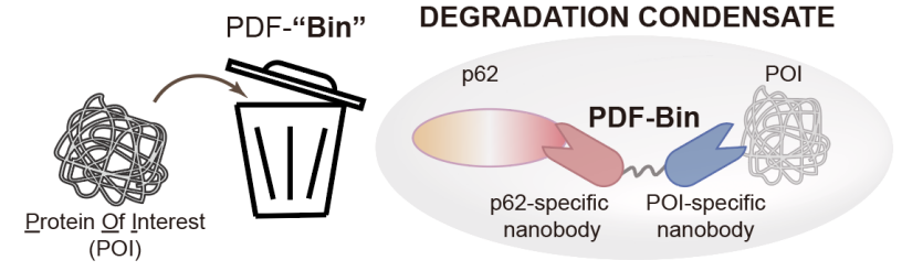 PDF-Bin取名自P62 Degradation Factory based on a BI-specific Nanobody(基于双特异性纳米抗体的p62降解工厂),由特异性结合p62的纳米抗体(Pn)、特异性结合靶标蛋白的纳米抗体和一段柔性连接子所构成。为了获得p62的纳米抗体,研究人员通过噬菌体展示技术联合显微成像共定位分析进行筛选,获得了3种特异性结合p62的纳米抗体(A1E、D9A和E12C)。将这3种Pn分别融合EGFP荧光标签的纳米抗体Gn构建而成的PDF-Bin(A1E-Gn、D9A-Gn和E12C-Gn)均对EGFP-TDP43蛋白具有较好的降解效果。