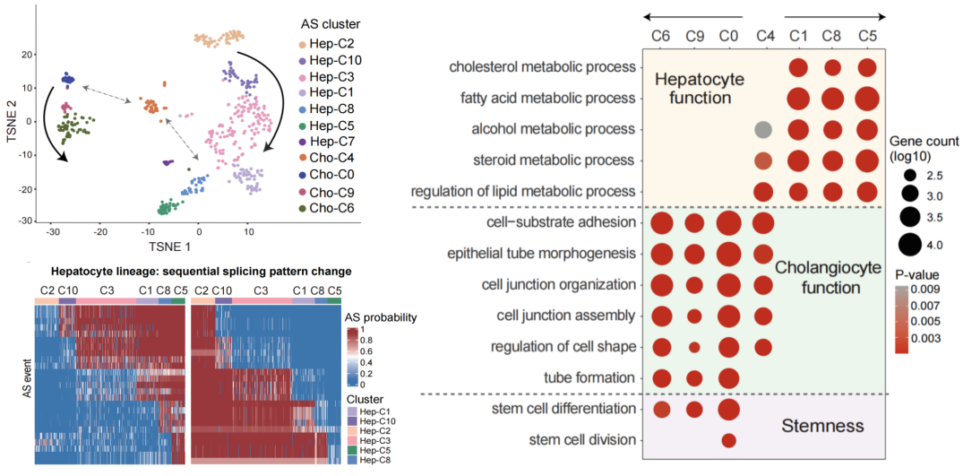 在对正常组织发育动态过程的解读中,SCASL也表现出独特的优势。例如,SCASL重现了小鼠胚胎肝脏中肝母细胞发育为肝细胞和胆管细胞的两个谱系,明确定义了分化谱系中的时序过渡态细胞。更有趣的是,SCASL基于剪接谱的分析揭示了一个特殊的细胞簇,它此前被定义为胆管细胞,但其剪接谱位于肝细胞和胆管细胞两个发育谱系之间,且同时表现出两种细胞的功能特征,表明其可能代表了肝脏发育过程中两个细胞分化路径之间的交流。