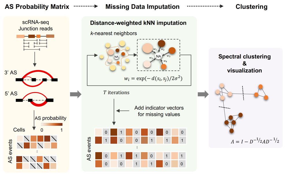 高等真核生物中的RNA可变剪接是重要的转录后调控机制。通过剪接模式的变化,细胞中同一个基因可以生成多个不同的转录本,极大扩展了转录组及蛋白组的复杂性,体现了基因表达及功能的多样性与可塑性。传统的基因表达谱数据仅能反映基因总体表达丰度,无法表征转录后RNA剪接这一重要调控层级。因此,复杂组织的细胞异质性分析有必要补足RNA剪接谱这一关键维度的缺失。