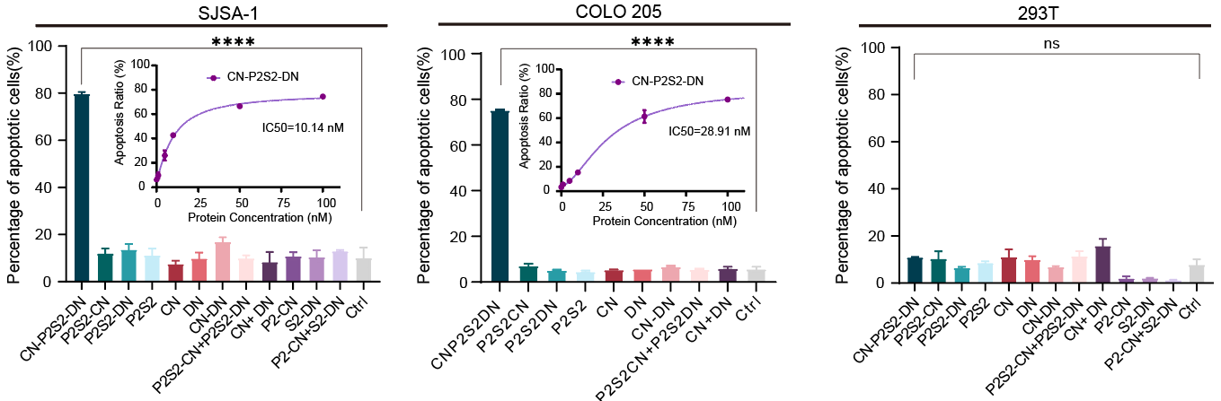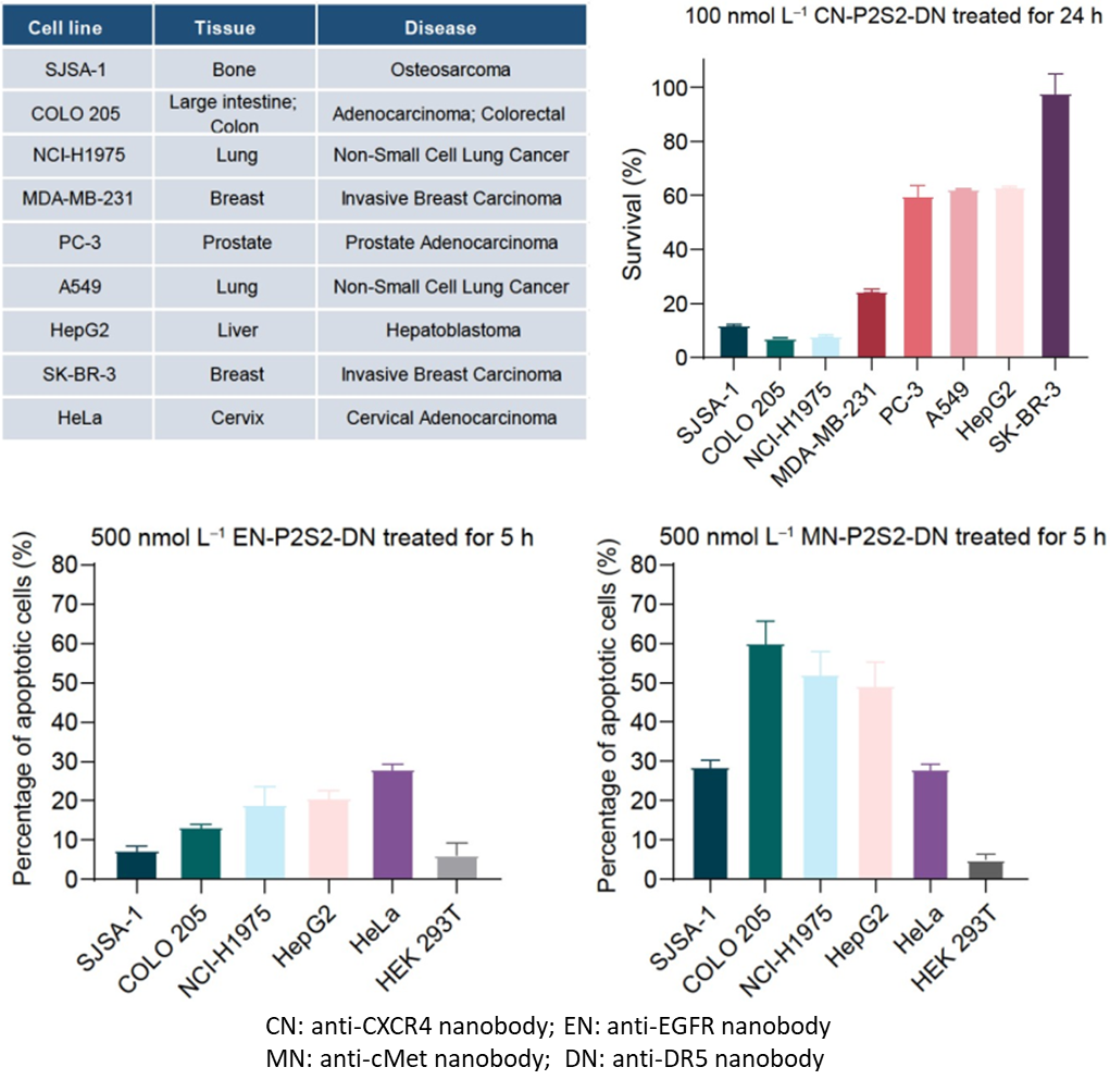 这类名为“相分离肿瘤杀手(phase-separated Tumor Killer,psTK)”的触发器,尽管设计简约,却能够诱导死亡受体与肿瘤相关受体的共聚集,从而实现相分离介导的条件性凋亡激活(图1)。值得注意的是,传统设计常采用如SUMO3和SIM(SUMO3-interacting motif)这对相互作用基序,通过调整其串联表达的数量来重构多价依赖的相分离现象,但这对后续的产业化应用和转化提出了更高的要求和挑战。为了进一步优化融合蛋白的表达形式,该研究巧妙地设计了基于低价态串联重复的相分离元件,即均为二价PRM和SH3的组合(简称P2S2)。将分别靶向结合肿瘤细胞表面高表达的CXCR4(C-X-C chemokine receptor type 4)和死亡受体DR5(Death receptor 5)的纳米抗体CNB和DNB与P2S2融合表达,得到了融合蛋白CN-P2S2-DN。相比早期设计,CN-P2S2-DN同样能够介导相分离依赖的肿瘤细胞凋亡,且以单一蛋白形式的制备更为高效、便捷。此外,这种设计在肿瘤特异性靶点(包括EGFR、MET等)及疾病适应症的拓展方面也显示出了显著的特异性肿瘤细胞杀伤效果。