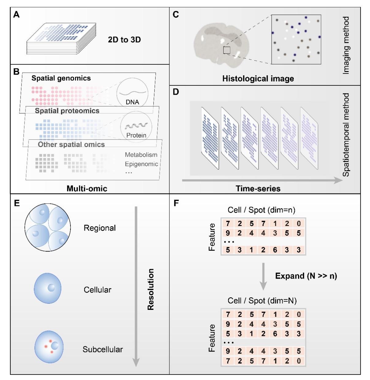 在本次发表的综述论文中,作者重点剖析了未来的方法学研究需要解决的潜在挑战。随着空间转录组分析技术的快速发展,数据的复杂性和维度也在不断增加(图2),其中包括:从2D到3D数据的扩展;揭示组织内时空动态的时空组学分析;多模态和多组学数据的可扩展和可解释性分析;高解析度分子特征的空间插补以及亚细胞解析度的分子互作信息挖掘等。为解决这一系列挑战,未来的方法学研究需要设计理论的创新以及更高解析力的分析技术,特别是高性能AI技术的引入。