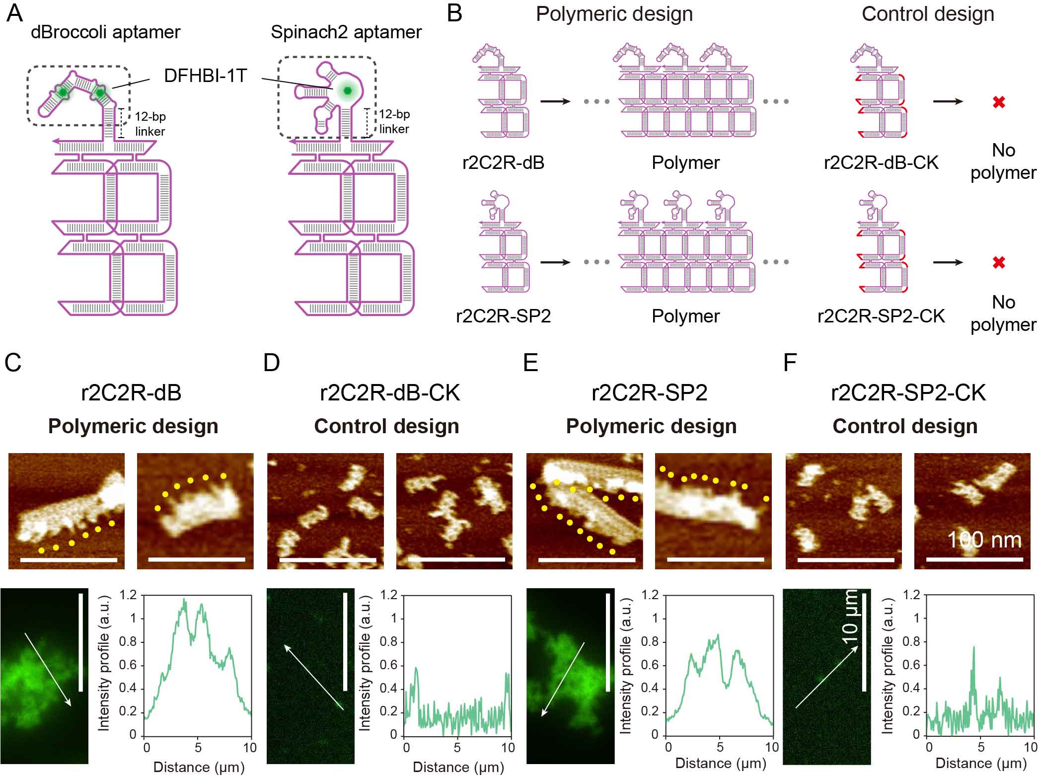 图 2. 功能化单链RNA网格状纳米结构的构建。 (A)两种具有荧光活性的RNA网格状纳米结构示意图。(B) 单分散性和可聚集性纳米结构的设计。(C-F) 功能化单链RNA网格纳米结构的原子力显微镜和荧光显微镜表征结果。