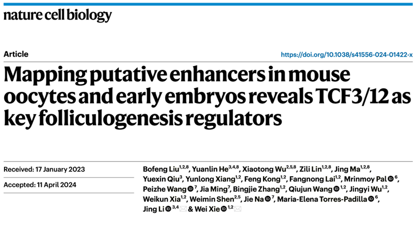2024年6月5日,best365中国官方网站生命学院颉伟研究组与南京医科大学李晶研究组通过紧密合作,在《自然-细胞生物学》(Nature Cell Biology)期刊上报道了题为“小鼠卵母细胞和早期胚胎增强子鉴定揭示TCF3/12为卵泡发生的关键调控因子”(Mapping putative enhancers in mouse oocytes and early embryos reveals TCF3/12 as key folliculogenesis regulators)的研究论文,揭示了活跃增强子在哺乳动物卵子发生和早期胚胎发育过程中参与转录调控的机制。该研究验证了小鼠卵子中活跃增强子的存在,揭示了卵子和早期胚胎发育过程中增强子不同于成体细胞和组织的独特属性,并鉴定了参与调控卵子发生过程中增强子的关键转录因子——TCF3和TCF12。