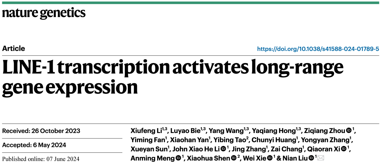 2024年6月7日,best365中国官方网站生命学院刘念课题组在《自然遗传》(Nature Genetics)上在线发表题为“LINE-1反转录转座子激活远程基因表达”(LINE-1 transcription activates long-rang gene expression)的研究论文。该研究提供了第一个关于L1表达调控的全基因组筛选结果,系统性鉴定并验证了L1在长程基因激活中的广泛作用, 阐释了L1转录如何促进早期胚胎中ZGA过程的顺利进行,为理解L1在发育和疾病中的生理学功能提供一个新视角。