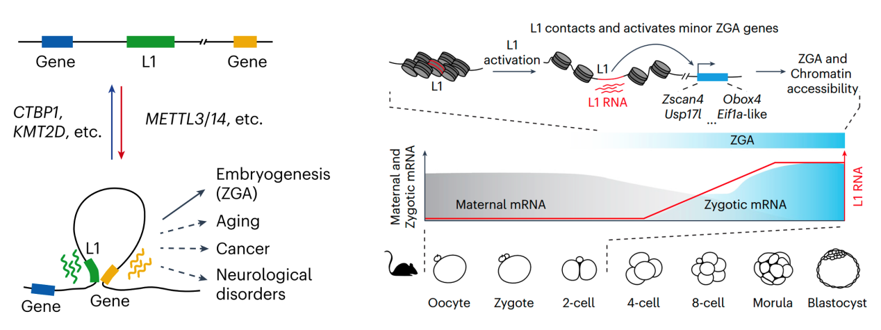 图1. L1的转录水平被功能多样的基因所精密调控,也决定着L1选择性地接触并激活远程基因表达的功能,影响着早期胚胎发育中的ZGA,也可能影响衰老、癌症和神经系统性疾病等(左)。L1转录激活了小鼠早期胚胎发育中的第一波转录行为(minor ZGA)(右)。