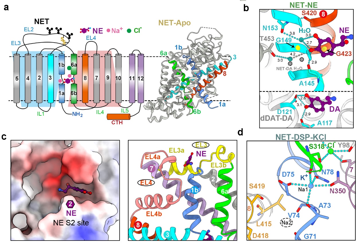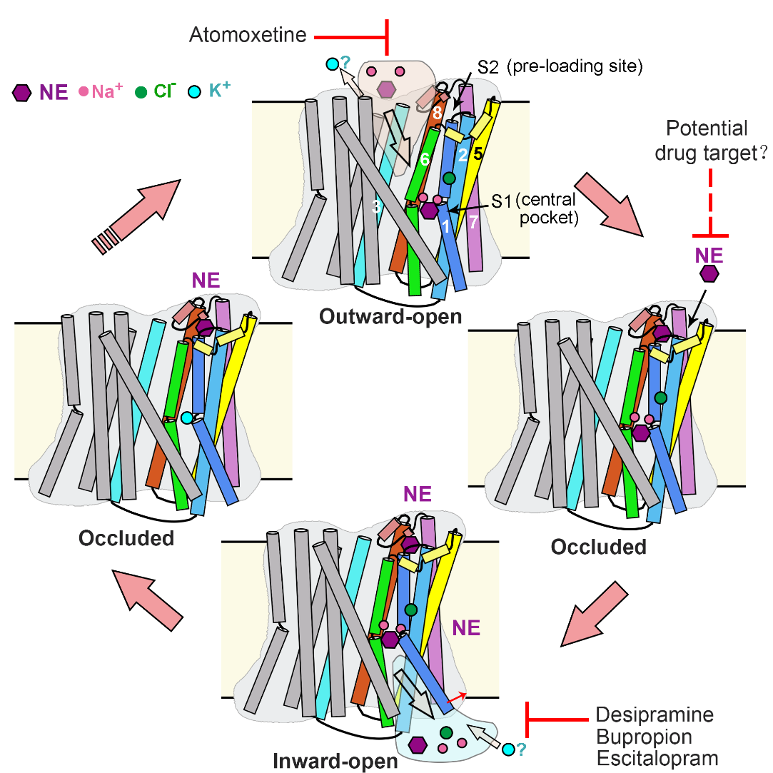 该研究亮点:首次发现了NET的第二个底物结合位点以及NSS家族的K+结合位点,揭示了NET底物识别机制、交替开放转运模型、以及不同类别抗抑郁药物选择性抑制的分子机制,为抗抑郁药物的进一步研发提供了基础。