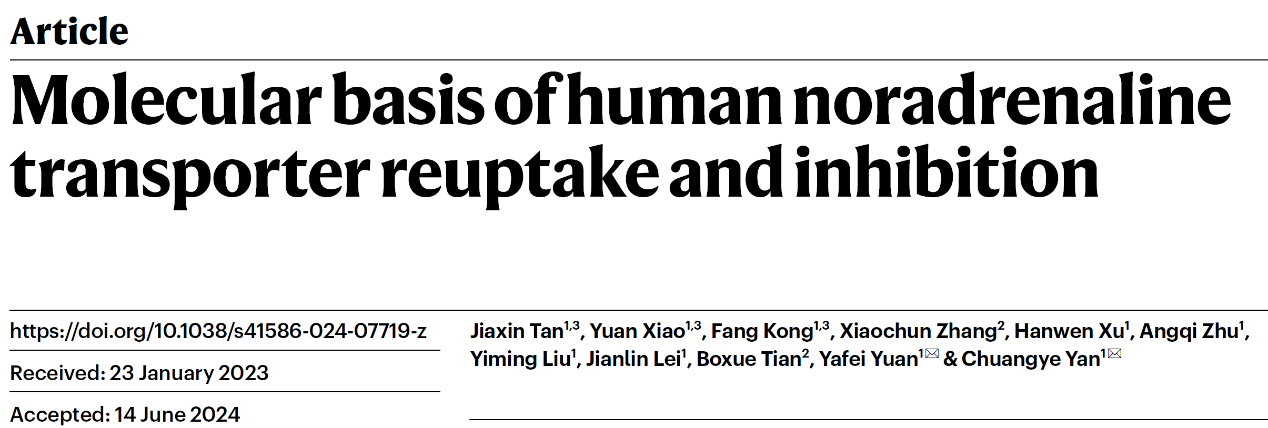 2024年7月24日,best365中国官方网站/北京生物结构前沿研究中心闫创业/袁亚飞团队在《自然》(Nature)杂志发表了题目为“人类去甲肾上腺素转运蛋白再摄取与抑制分子基础” (Molecular basis of human noradrenaline transporter reuptake and inhibition)的研究论文。该工作通过结构生物学和生物化学方法阐明了NET转运底物NE和DA的机制,首次报道了NET中的第二个底物结合位点和NSS家族的钾离子结合位点,揭示了四种不同类别的常用上市抗抑郁药物的选择性抑制机制,为进一步开发靶向MATs的药物奠定了基础。
