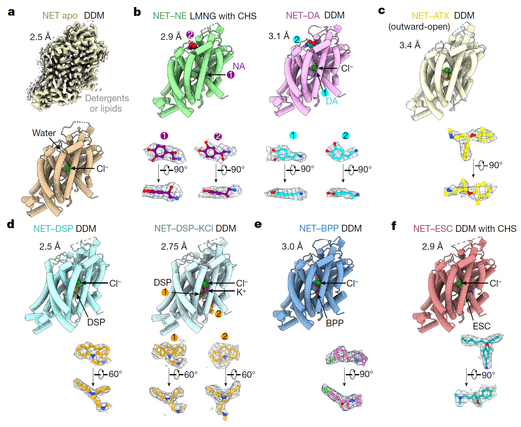 该团队利用冷冻电镜技术成功解析了人源NET蛋白的八个高分辨率结构,包括天然状态、结合底物(NE、DA)和四种常用上市抗抑郁药物(托莫西汀:Atomoxetine,ATX;地昔帕明 :Desipramine,DSP;艾司西酞普兰:Escitalopram,ESC;安非他酮:Bupropion,BPP)的结合状态。这些结构是天然蛋白在未使用任何基准标记或突变的情况下获得,分辨率在2.5到3.5埃之间(图2)。