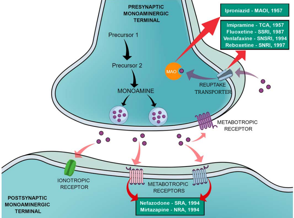 图 1 单胺能神经元中神经递质的传递过程及不同抗抑郁药物的作用方式1