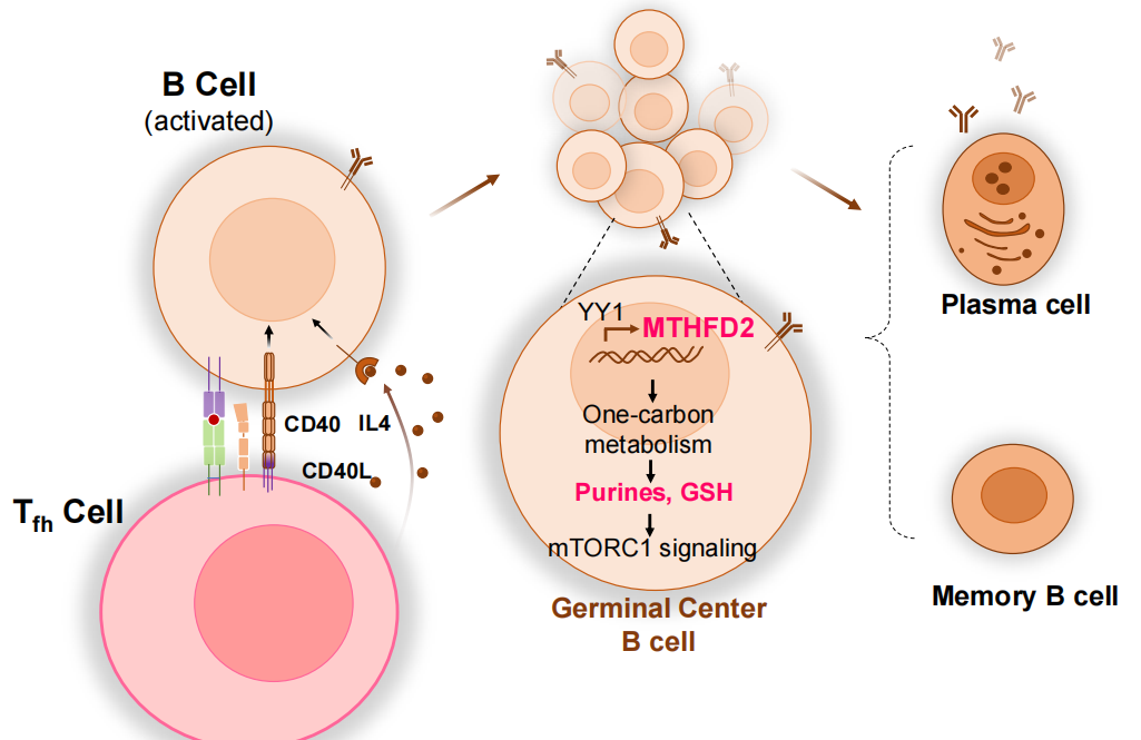 B细胞是适应性免疫应答系统的重要组成部分,具有包括分泌病原体特异性抗体等多种免疫效应功能。生发中心(GCs)中的体细胞超突变和B细胞选择可提高抗体对免疫抗原的亲和力和特异性。因此,生发中心(GC)B 细胞对产生 GCs 和长效体液免疫至关重要。虽然关于生发中心(GCs)的调控研究不在少数,且代谢可能影响了B细胞亚群的多样性,但生发中心B细胞(GC B)的形成与功能是否依赖或决定于一种共有的代谢方式,是一个极其令人感兴趣的问题。